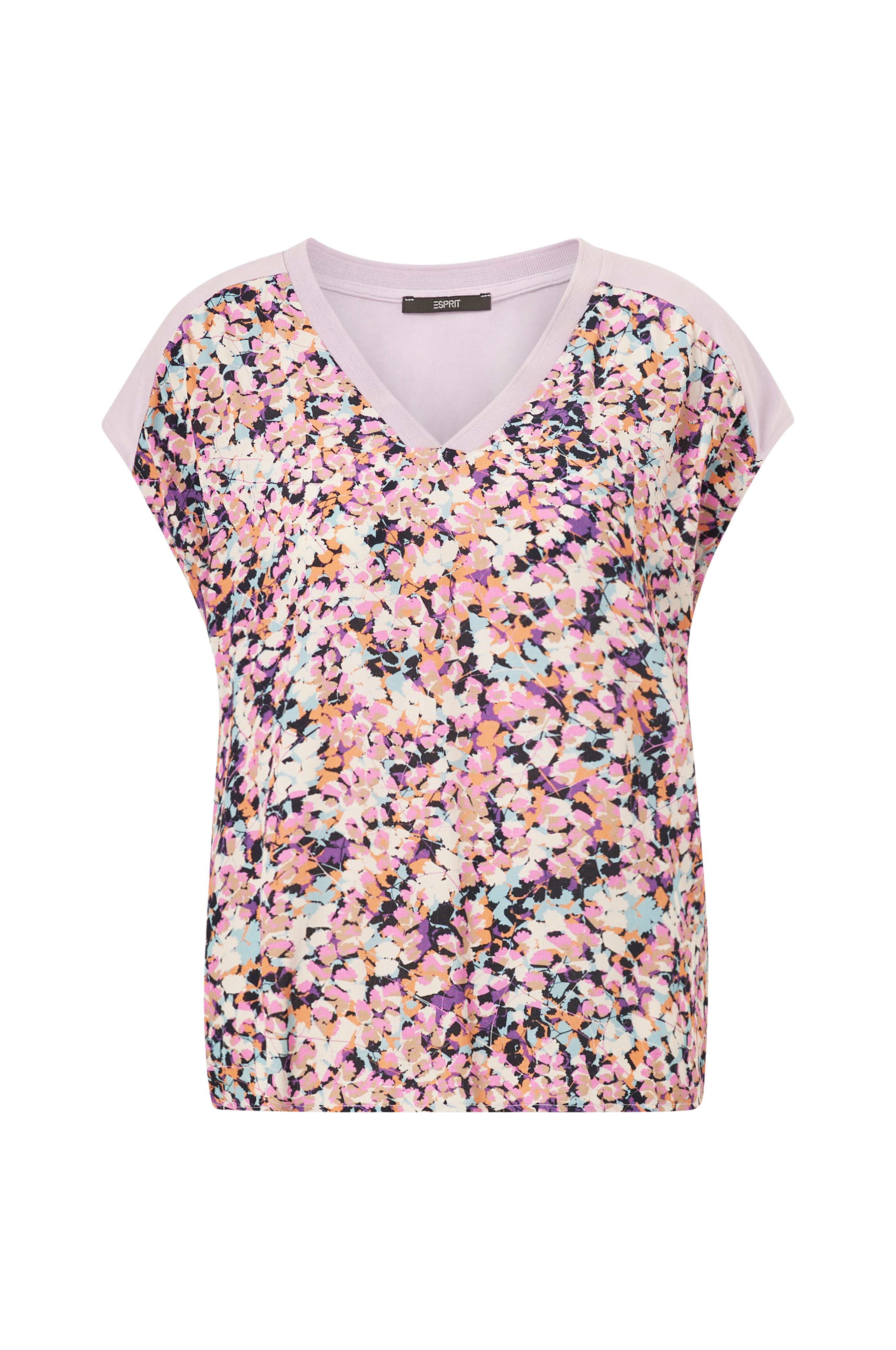 Trikoopusero, jossa etukappale kuviollista kangasta. V-pääntie, jossa joustinneulosreunus. Madalletut olkapäät ja lyhyet hihat.