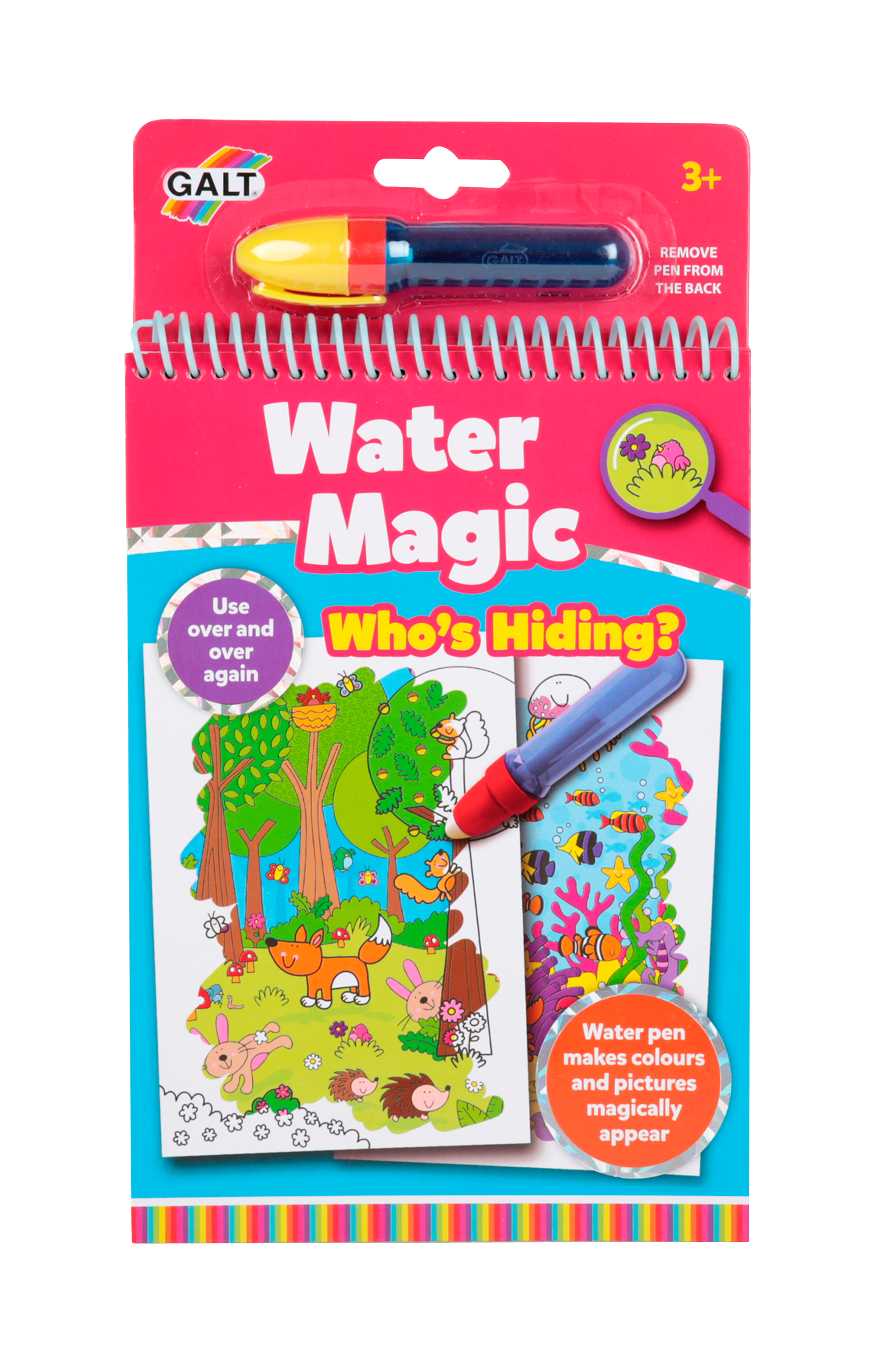 Kierrevihko, jossa kuusi väritettävää kuvaa. Lapsi voi värittää kuvat yhä uudelleen ja uudelleen mukana toimitettavalla vedellä täytettävällä kynällä. Kun paperiarkki kuivuu, väri katoaa ja kuviot koostuvat jälleen vain ääriviivoista. Täydellinen matkalla!