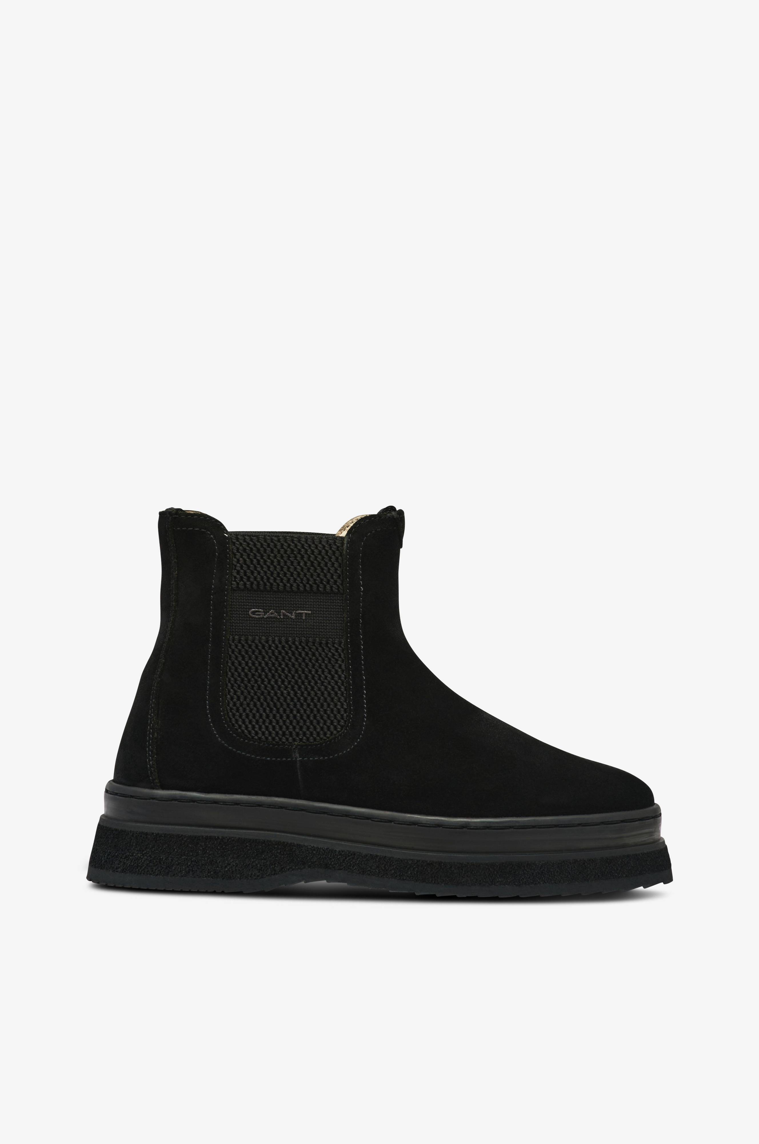 • Vuoratut chelsea-nilkkurit mokkanahkasta korokepohjalla • Joustopaneelit varren molemmilla puolilla • Vetoliuska edessä ja varren takaosassa • Lämmin, villan kaltainen vuori • Ulkopohja kumista • Pohjan korkeus: 4,5 cm • Varren korkeus: 14 cm koossa 37