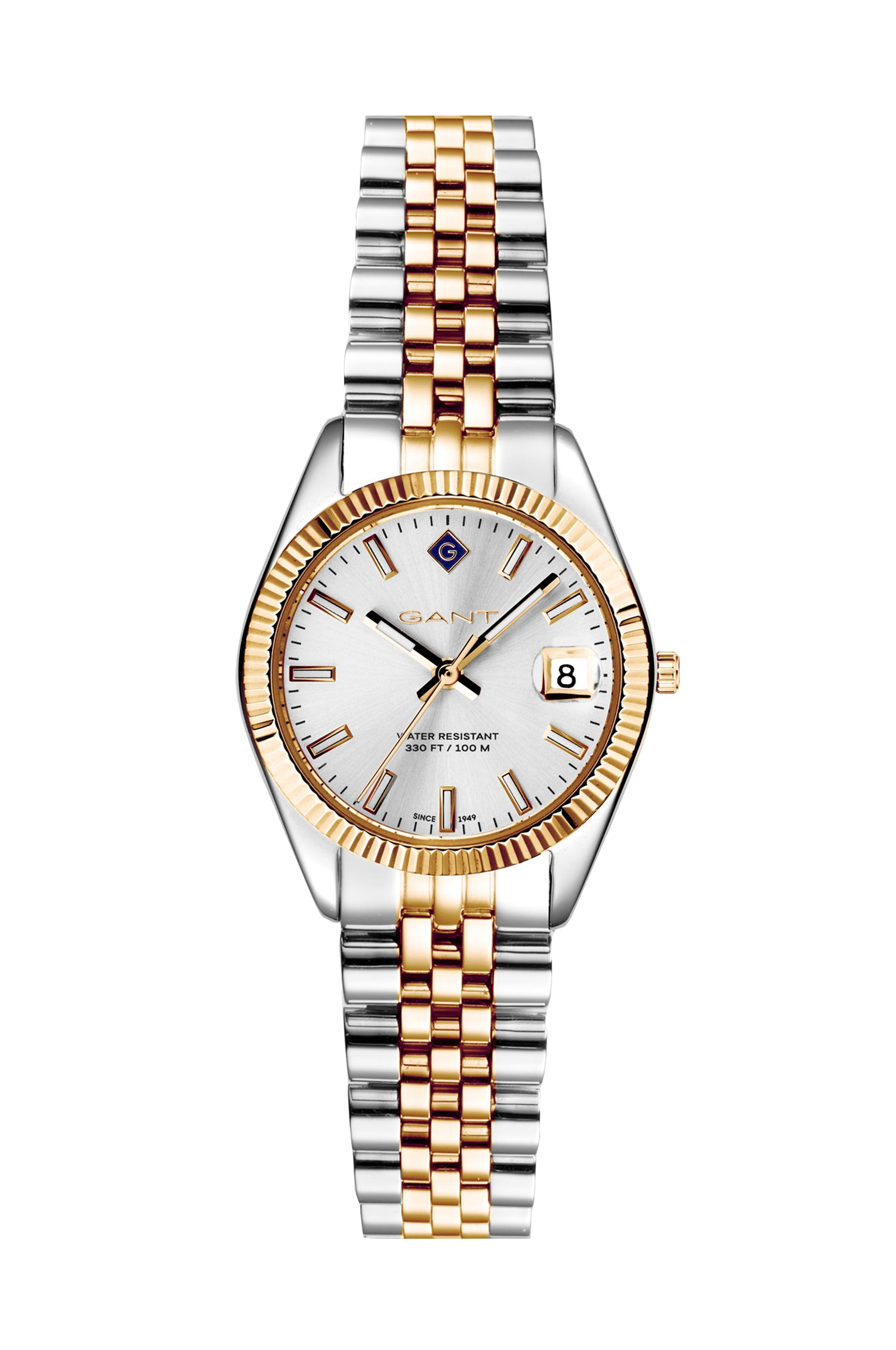 Minikello Gantilta. Ylellisistä materiaaleista valmistettu kello tuo naisellisuutta ikoniseen amerikkalaiseen urheiluvaateperintöömme. Kellossa on kolme viisaria, päiväystoiminto ja 10 ATM:n vedenkestävyys, ja se on valmistettu ruostumattomasta teräksestä, jossa on kullanvärinen ionipinnoite ja mineraalilasi.