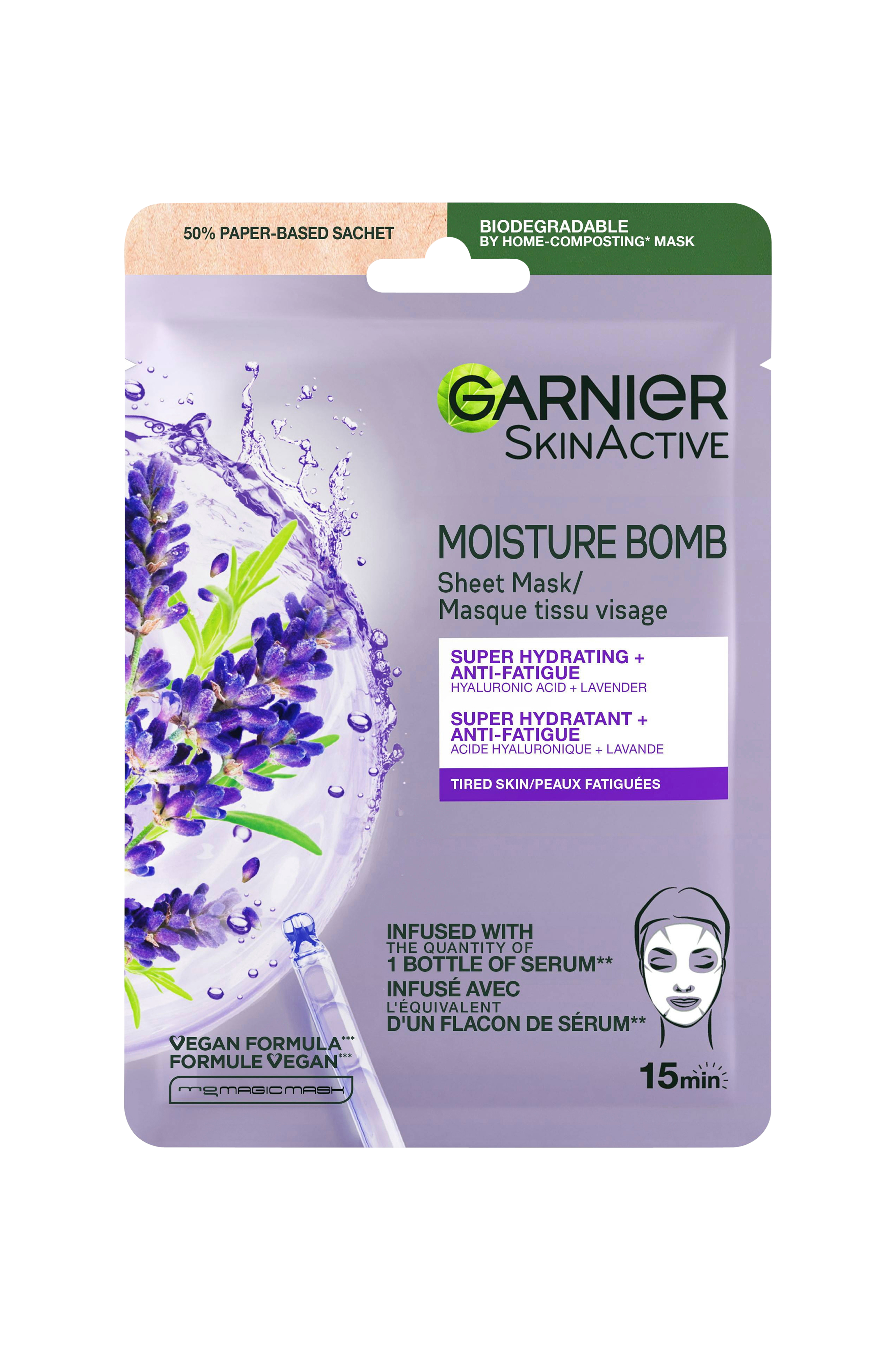 Garnier Moisture Bomb Lavender Tissue Mask sisältää seerumia, laventeliuutetta ja hyaluronihappoa, mikä takaa kosteuttavan ja rauhoittavan vaikutuksen. Sopii herkälle iholle, joka saattaa tuntua kuivalta ja punoittavalta. Tehokkaasti kosteuttava vaikutus vain 15 minuutissa. Iho tuntuu pehmeämmältä, miellyttävämmältä ja rauhoittuneelta. 4 viikon jälkeen: Väsymyksen merkit ovat vähentyneet ja ilo näyttää eloisammalta. Ihonsävy näyttää raikkaammalta, ja iho tuntuu kimmoisammalta ja täyteläisemmältä.