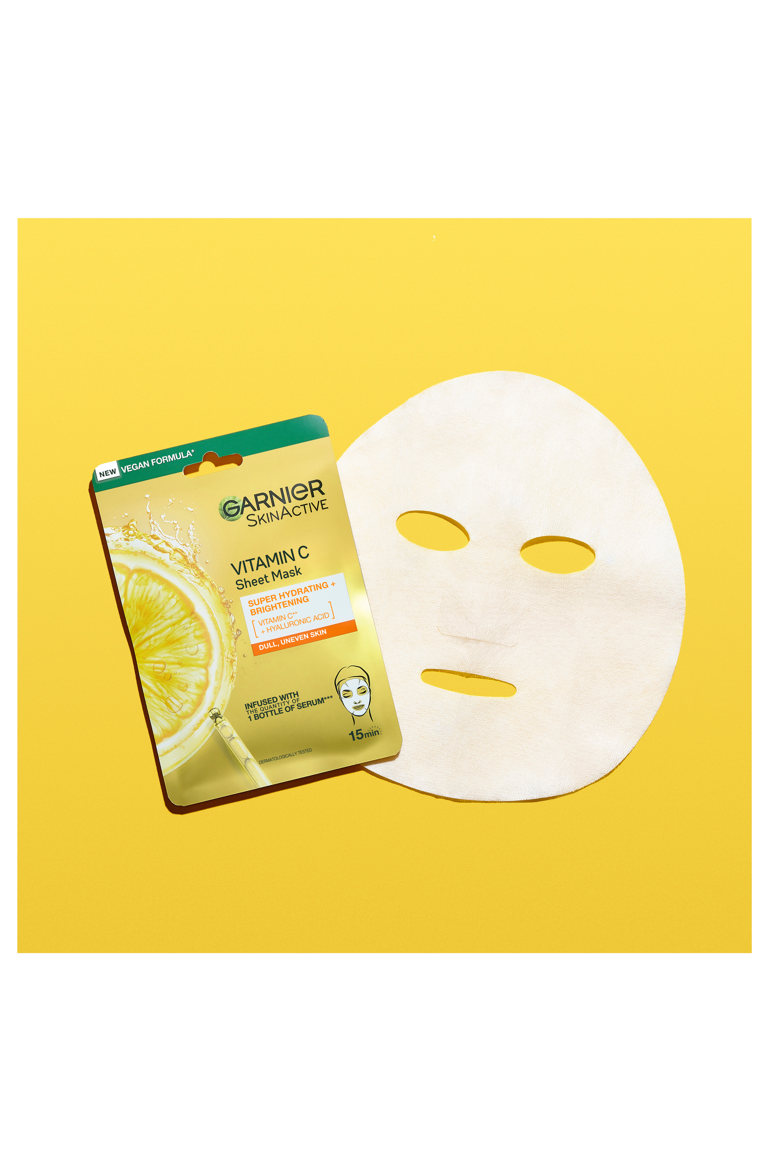 Garnier SkinActive Vitamin C Sheet Mask on erittäin kosteuttava ja heleyttävä kangasnaamio, joka tehokas kosteusvaikutus saadaan jo 15 minuutissa! Naamion tehoaineiden määrä vastaa seerumipullollista*, ja se sisältää runsaasti C-vitamiinia** sekä ihoa tasoittavaa hyaluronihappoa. Garnier SkinActive Vitamin C Sheet Mask on vegaaninen*** ja sopii herkällekin iholle.