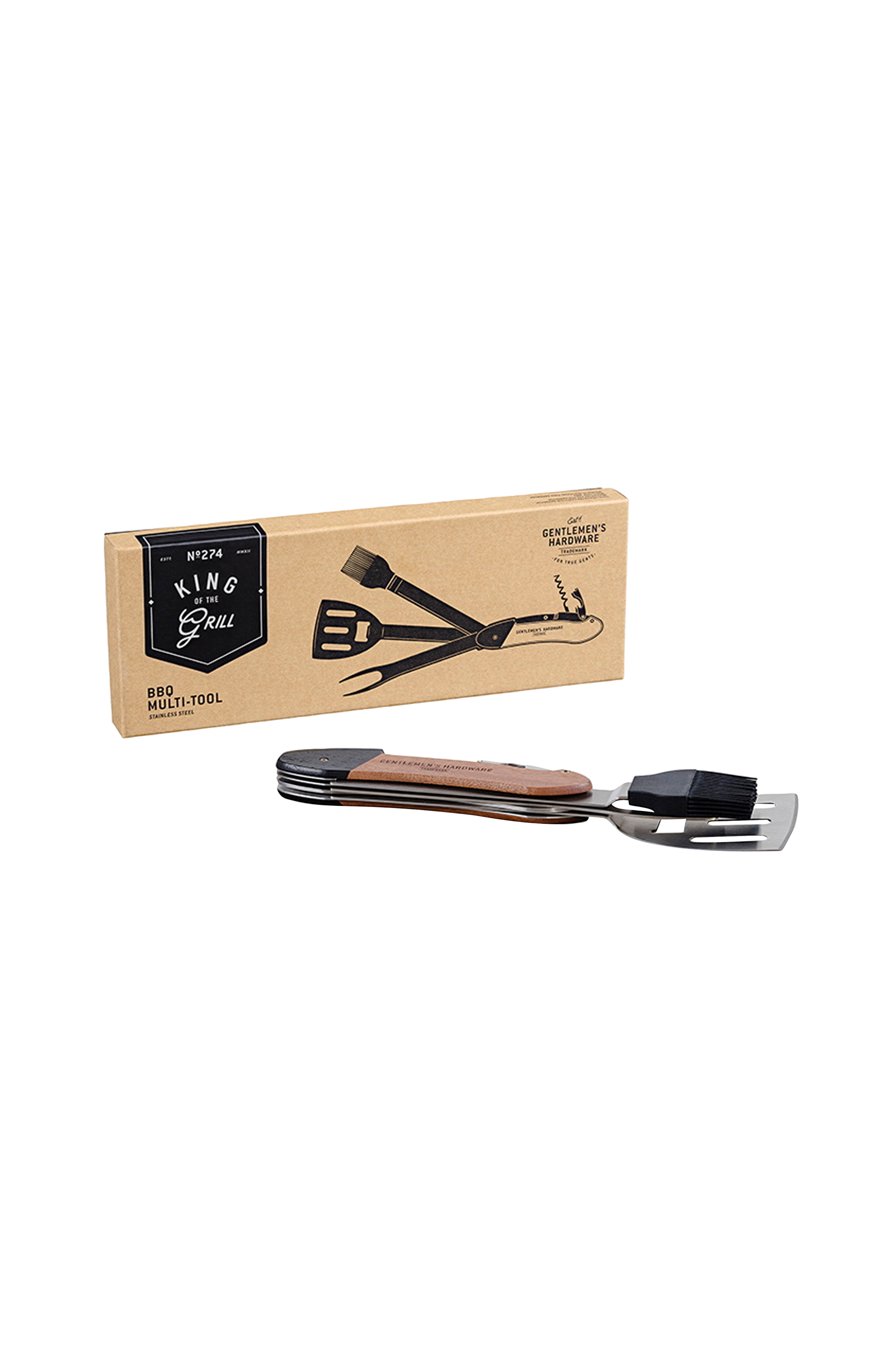 Multi bbq -työkalu herrasmiesten rautakaupasta!Sisältää kaksi pullonavaajaa, korkkiruuvin, lastan, haarukan ja grilliharjan.