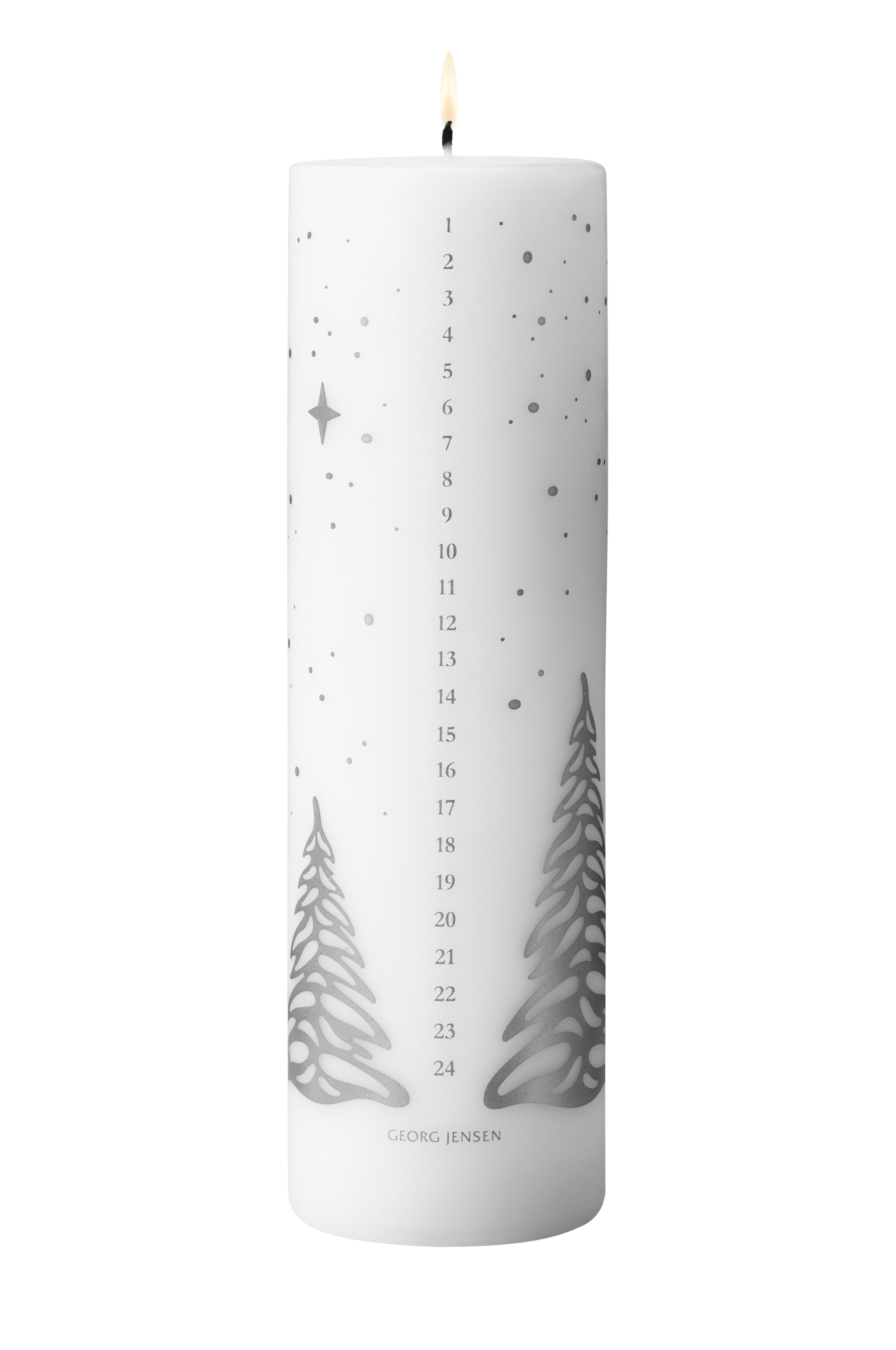 Vuoden 2023 kalenterikynttilä on koristeltu Sanne Lund Trabergin suunnittelemilla hopeanvärisillä joulukuusilla. Kalenterikynttilä on kaunis koriste, kun lasket jouluun jäljellä olevia päiviä talvisessa hämärässä.