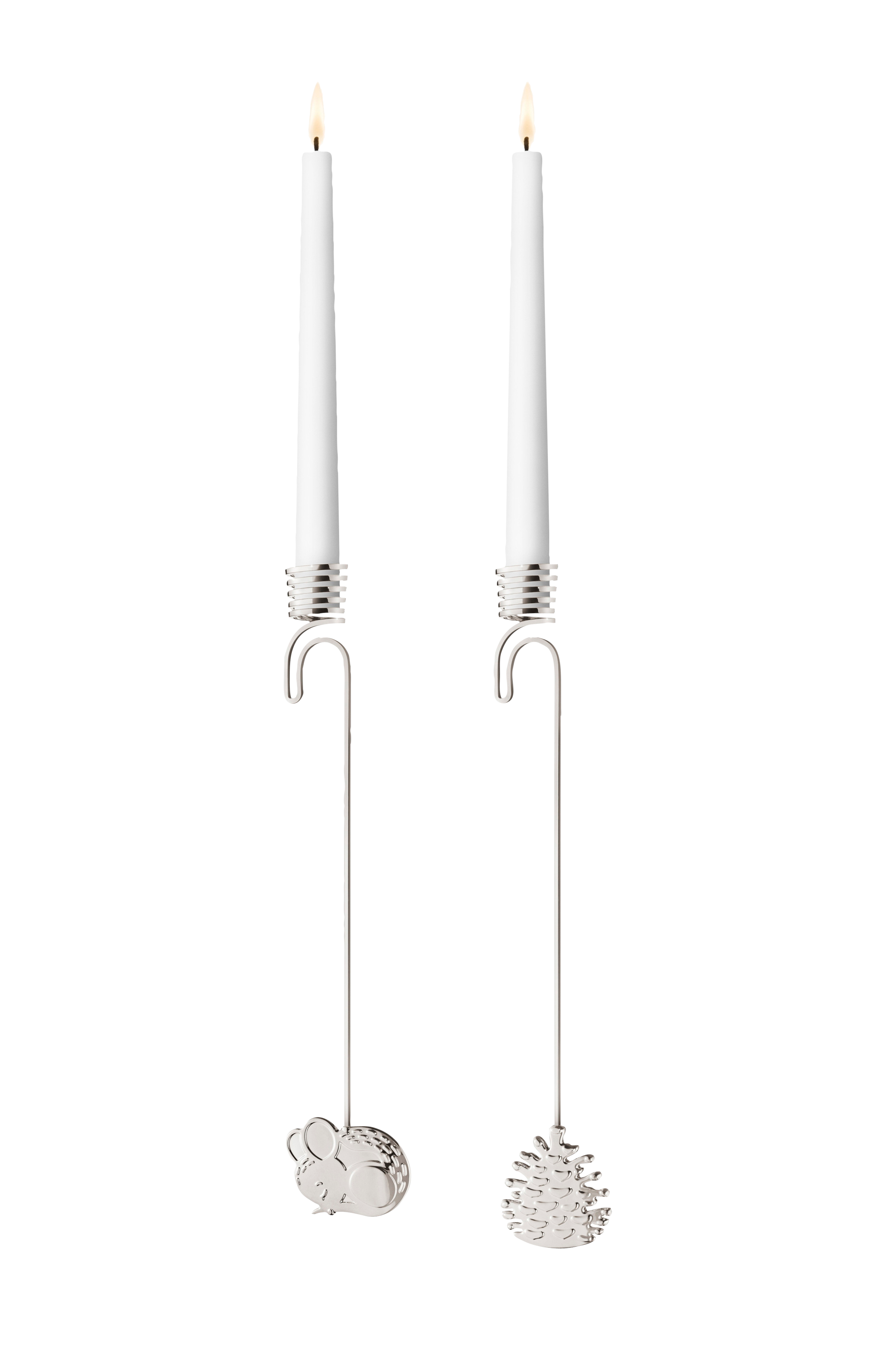 Näitä kahta joulukuusen kynttilänpidikettä koristavat talvisen metsän aiheet, jotka ovat innoittaneet suunnittelija Sanne Lund Trabergia vuoden 2023 joulumalliston luomisessa. Kynttilänpidikkeet esittävät nukkuvaa hiirtä ja kuusenkäpyä, ja ne on valmistettu 18 karaatin palladiumilla pinnoitetusta sinkistä. Aiheet sopivat yhteen malliston muiden osien kanssa - myös ne ovat taianomaisen talvisen metsän innoittamia.