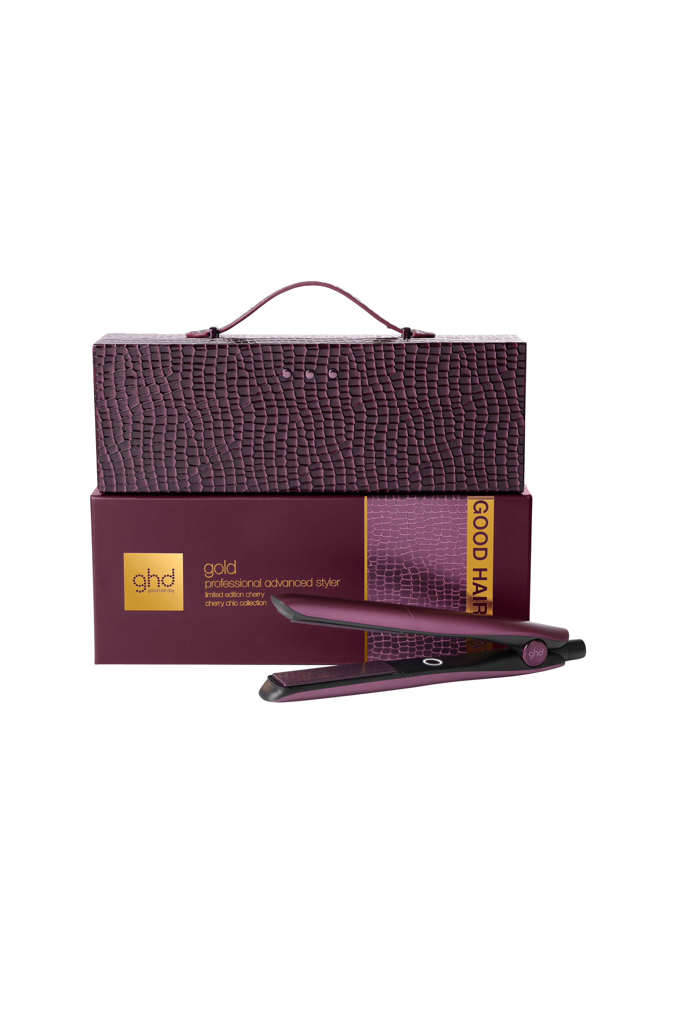 Ilmoittaudu viiden tähden hiuksiin tänä juhlakaudella ghd:n cherry chic -mallistolla - rajoitettu erä, joka on pukeutunut houkuttelevaan kirsikanpunaiseen sävyyn. Olitpa sitten lähdössä juhlalliselle pakomatkalle tai vain tuomassa korotettua kauneutta arkeen, ghd Gold® -ammattilaisen kehittynyt muotoilulaite saapuu ylellisessä, matkasta inspiroituneessa kotelossa¹, joka on suunniteltu tekemään jokaisesta muotoilukerrasta hemmotteluhetki.