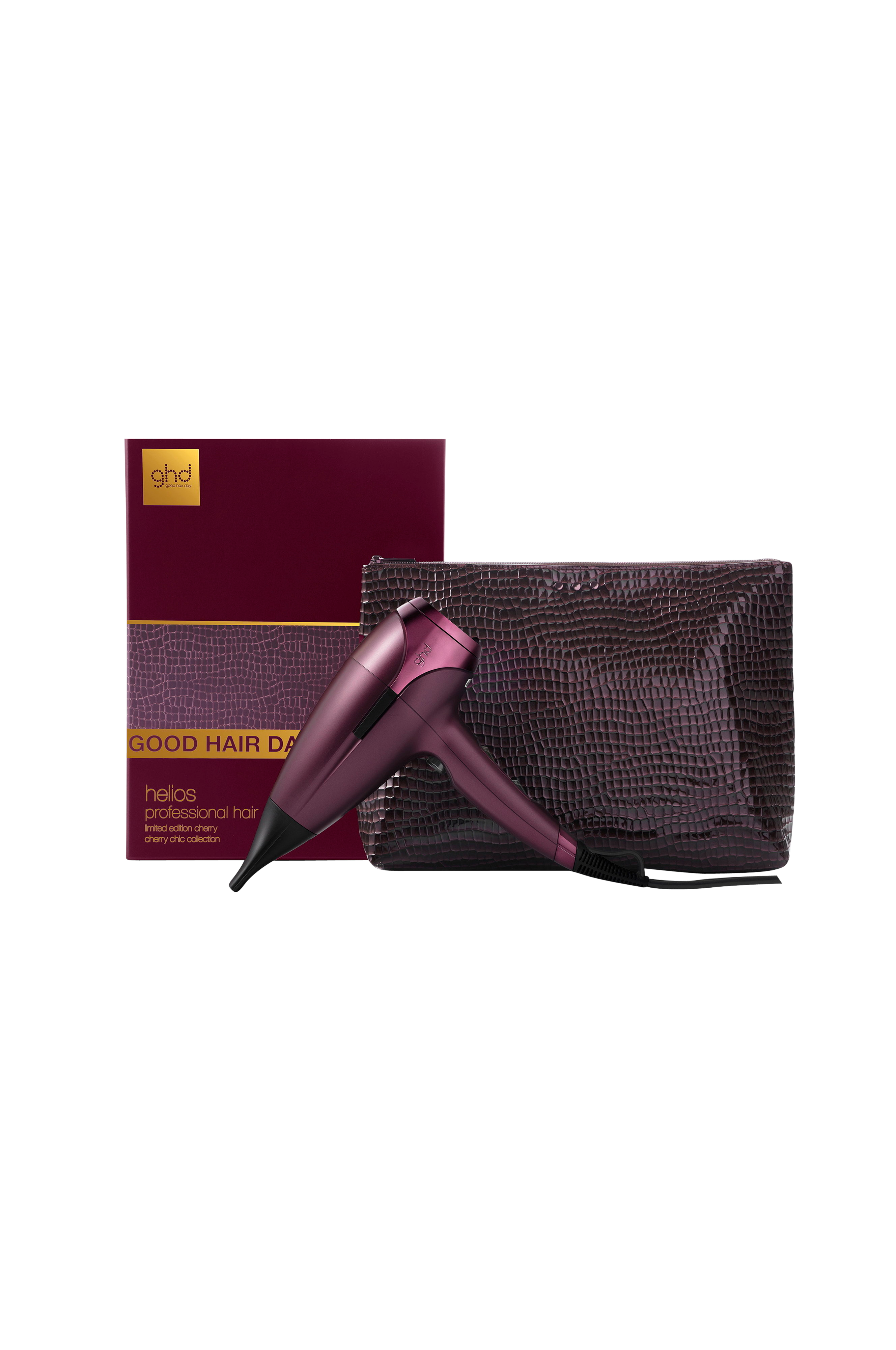 Astu täydellisyyden ja viiden tähden hiuslahjojen kauteen ghd:n cherry chic -mallistolla, jossa klassinen glamour kohtaa ammattilaistason muotoilun. Tämä juhlallinen valikoima on ajattoman viehättävyyden ja tyylikkyyden juhlaa, ja ghd Helios™ -ammattilaishiustenkuivaaja on keskipisteessä, ja se on verhottu runsaaseen kirsikanpunaiseen sävyyn, ja sen mukana on sopiva pesulaukku, joka takaa vaivattoman tyylikkyyden liikkeellä ollessasi.