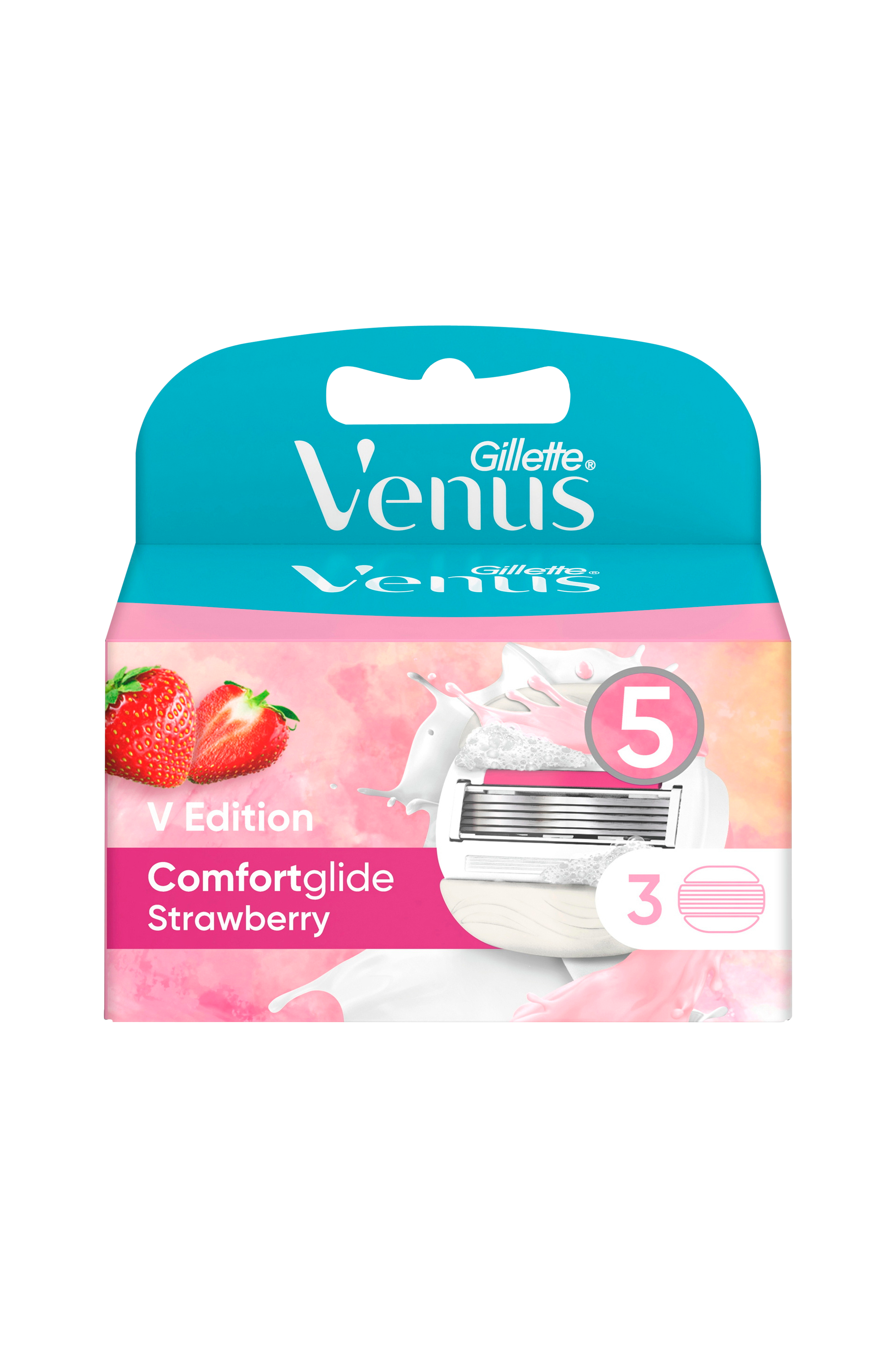 Naisten Venus V Edition Comfortglide Strawberry -varsiterässä on 5-teräinen vaihtoterä sileän, tarkan ja kestävän karvanpoiston varmistamiseksi. Vaihtoterissä on ylelliset kosteuttavat nauhat, joissa on kevyt mansikan tuoksu. Ne lukitsevat kosteuden ihoon ja ehkäisevät ihon kuivumista. Nivelletty muotoilu myötäilee vartalon linjoja.