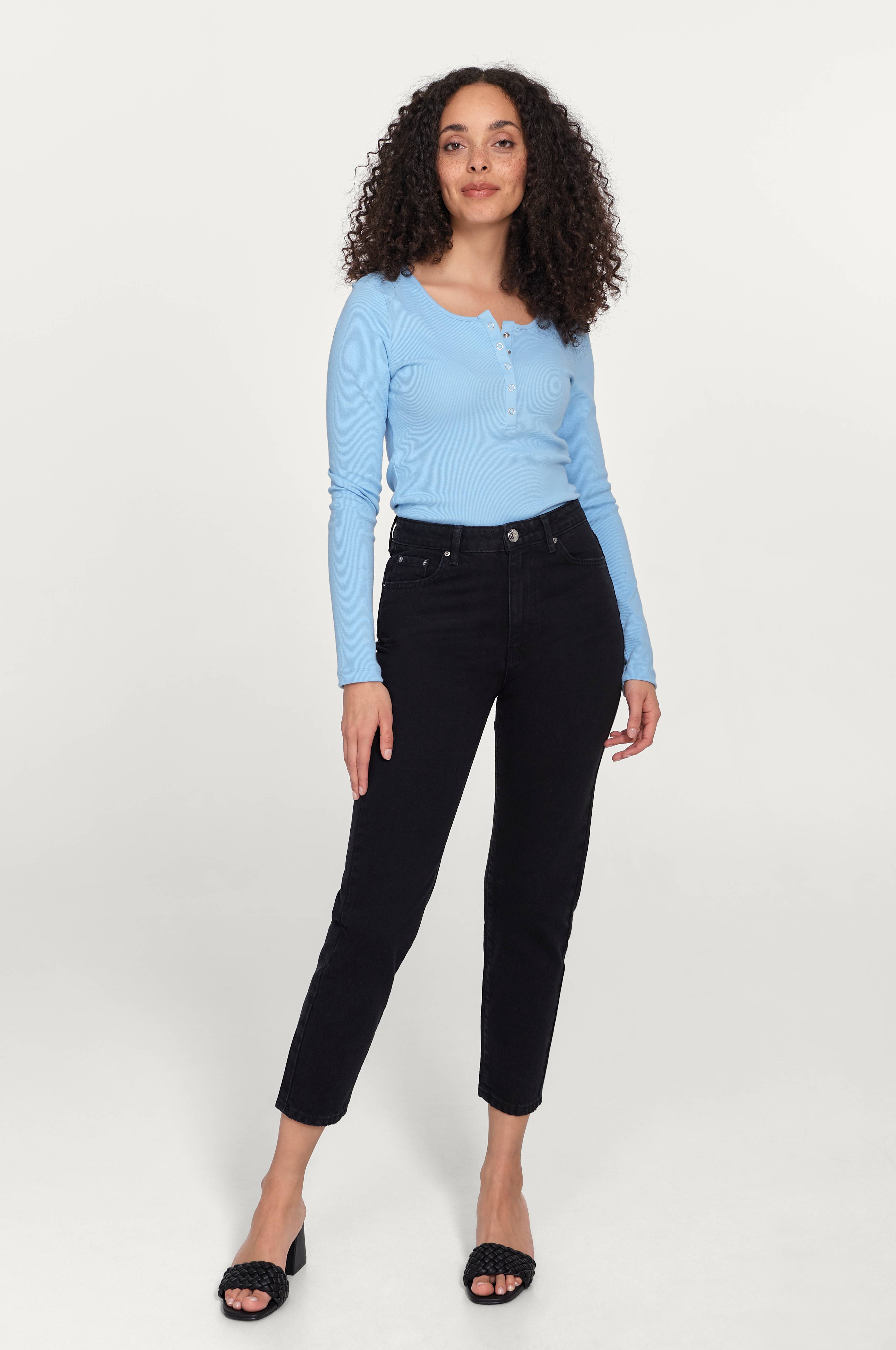 Farkut, joissa korkea vyötärö ja kapenevat lahkeet. Viistaskumalli ja vetoketjullinen etuhalkio. Rento istuvuus. Joustamatonta denimiä. Lahkeen sisäpituus n. 68 cm koossa 36.
