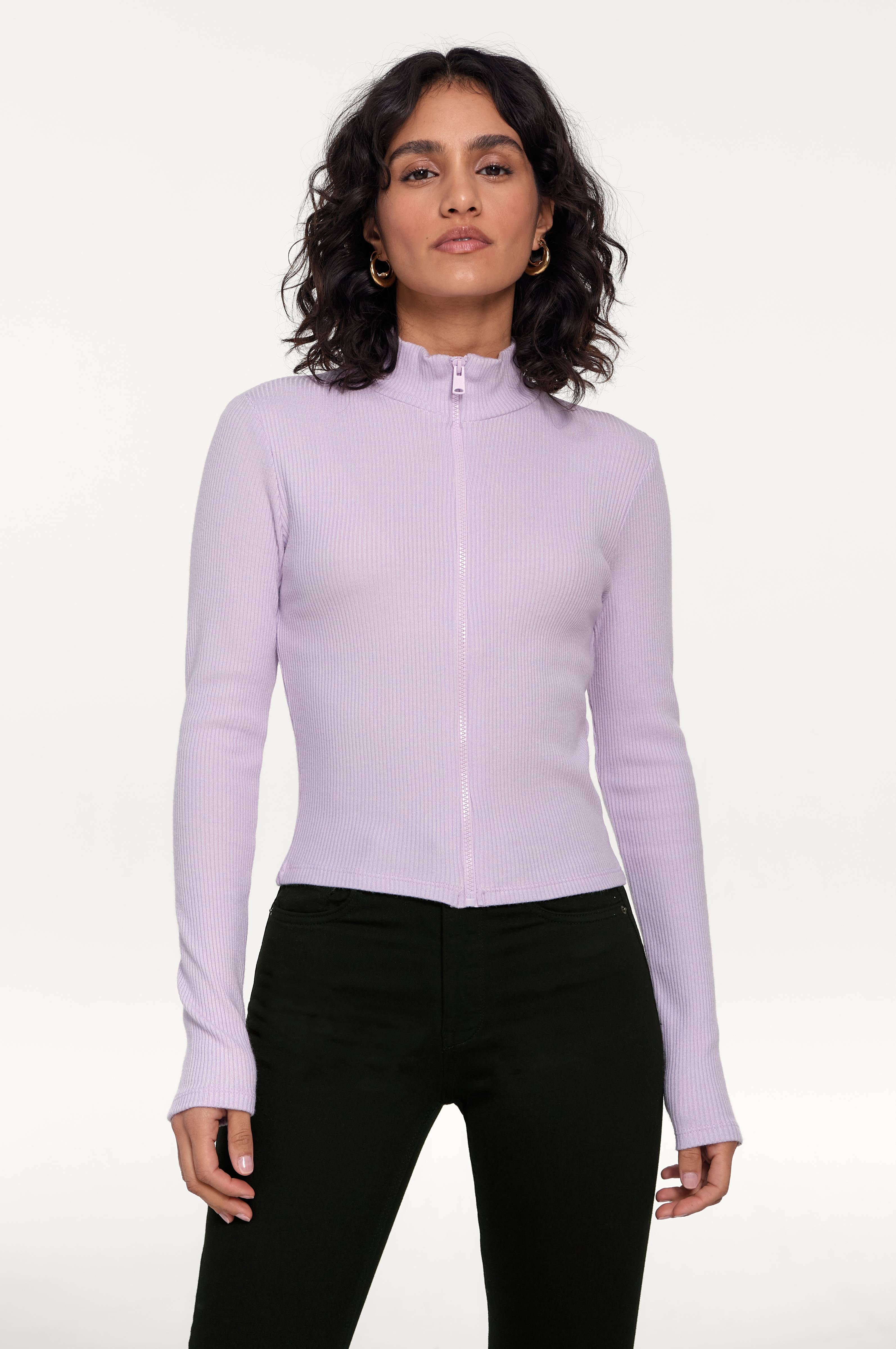 Lyhyt joustinneuletakki pehmeää viskoosisekoitetta. Vetoketju edessä ja pystykaulus. Kapea istuvuus.