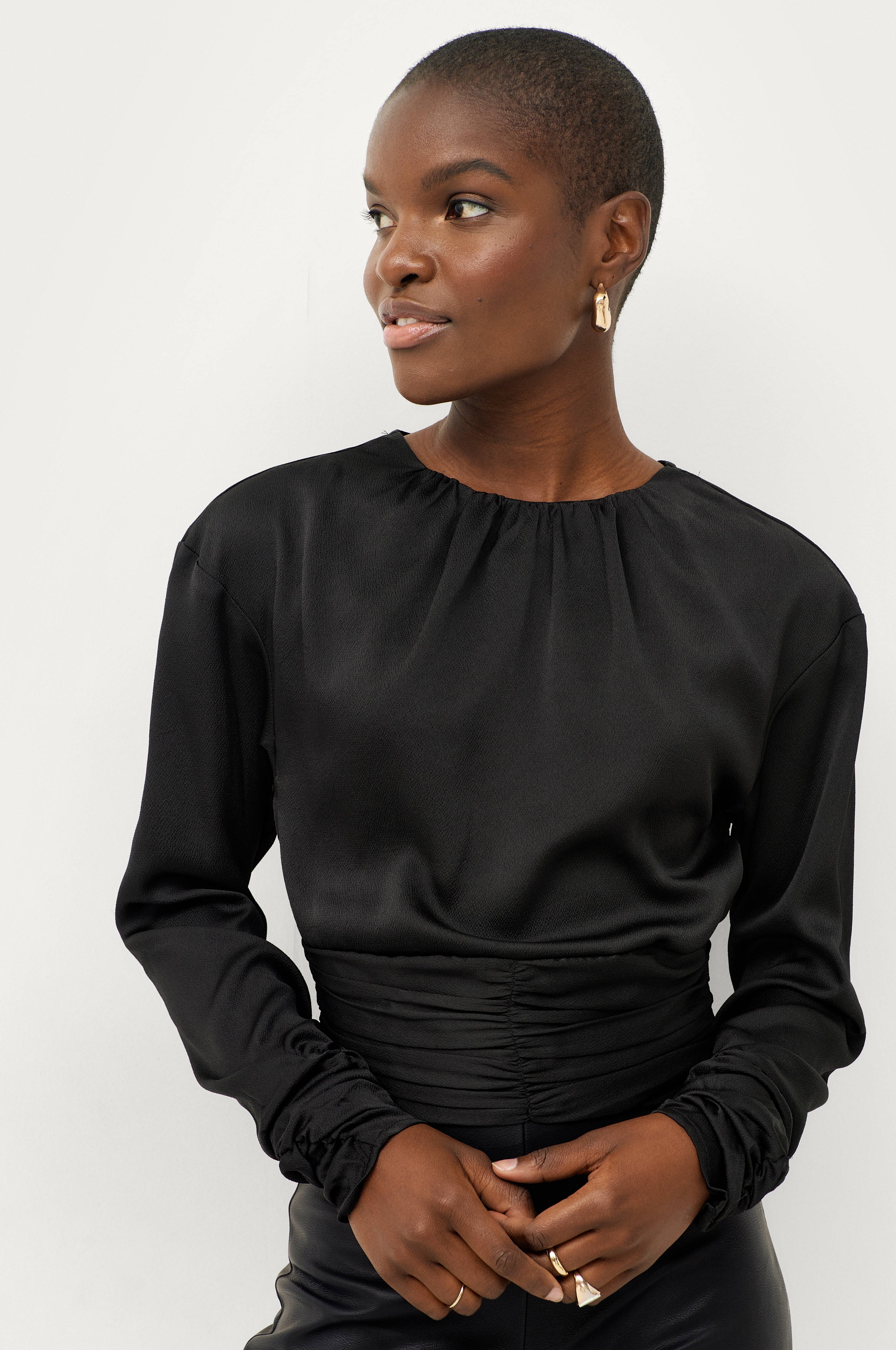 Hohtavaa materiaalia. Lyhyt malli, jossa poimutus helmassa edessä ja smokkirypytys helmassa takana. Pyöreä pääntie, jossa poimutus edessä sekä halkio ja nappi takana. Pitkät hihat, hihansuissa joustava poimutus.