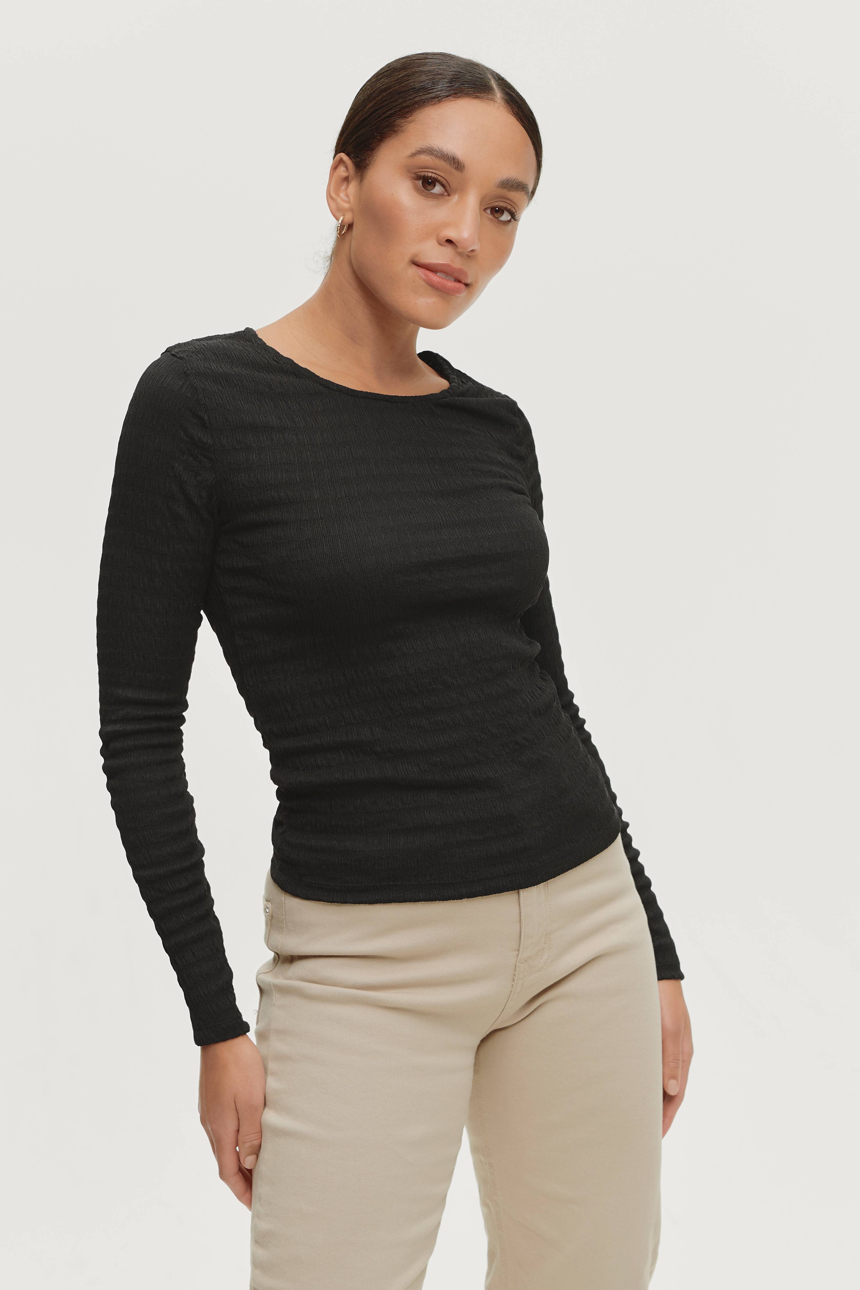 Gina Tricot Lisa Smocked Top -pusero. Vartalonmyötäinen malli kauttaaltaan pehmeästi smokkirypytettyä jerseytä. Pyöreä pääntie, jossa kapea päärme.