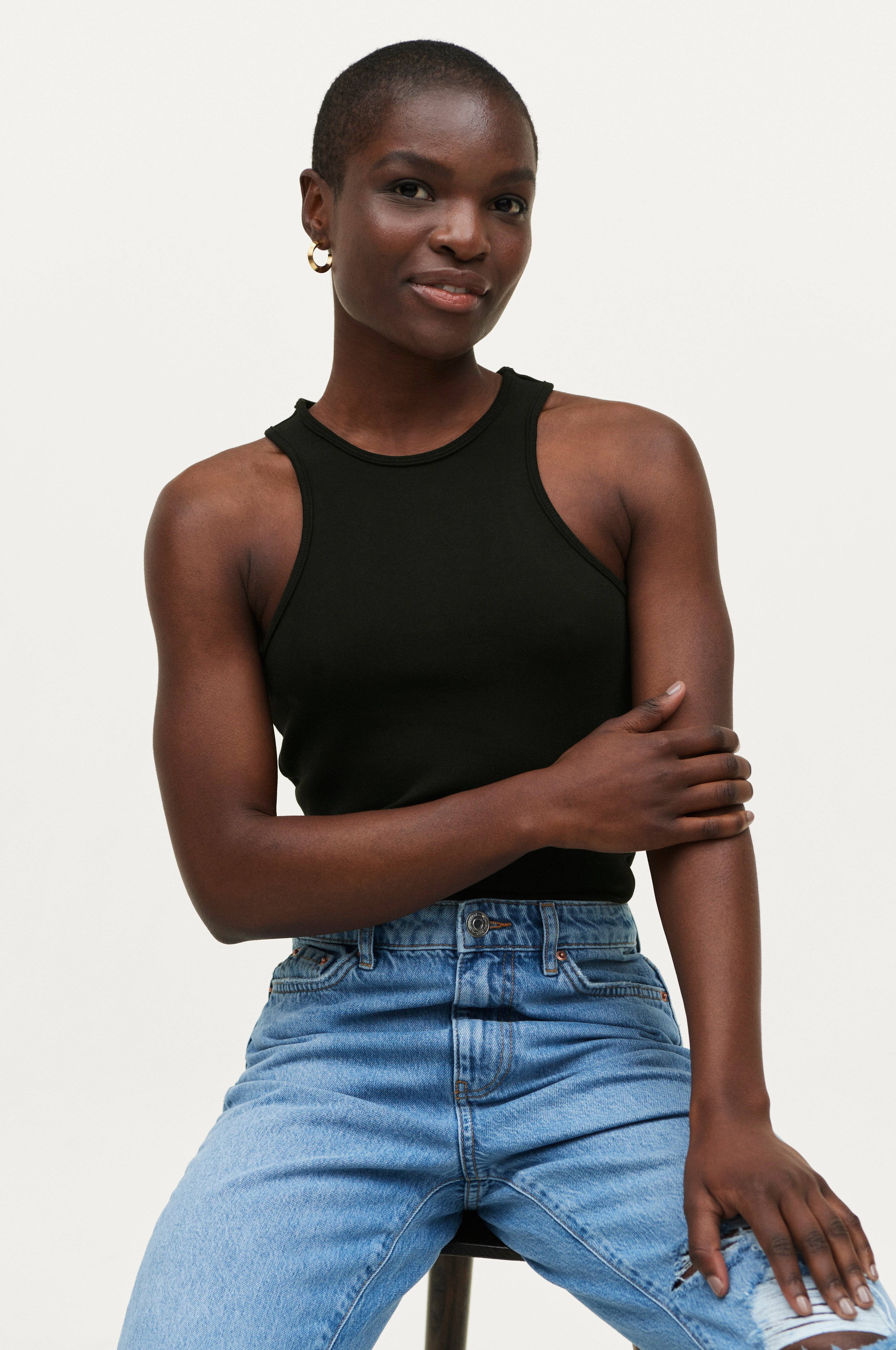 Malli on 164 cm pitkä ja hänellä on päällään koko S