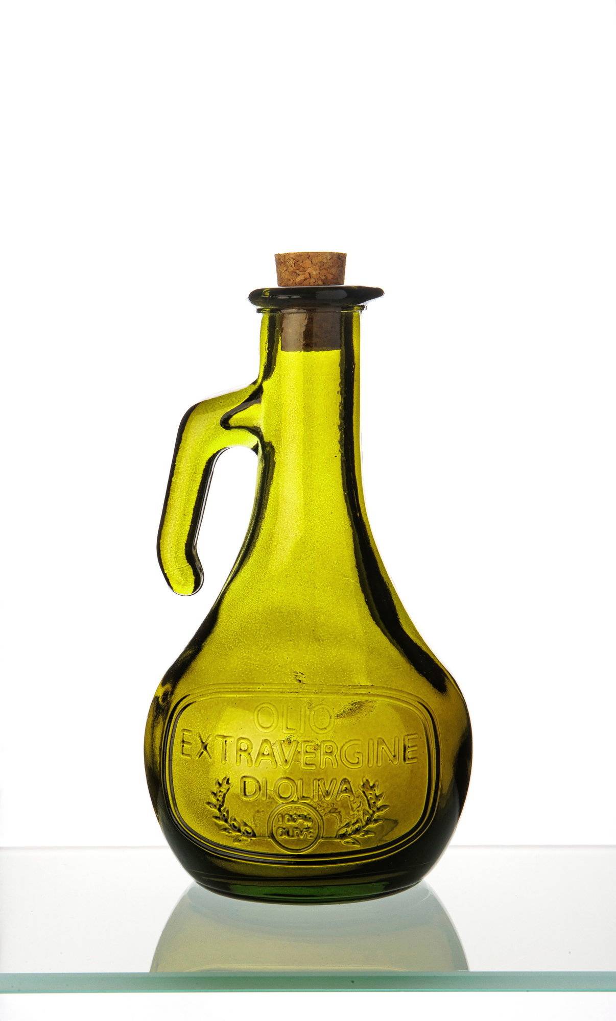 Vihreä lasinen oliiviöljypullo, jossa on kaunis koristeellinen kuvio ja jossa on kaatosuihku ja korkki. Tämä hienostunut öljypullo on suunniteltu paitsi houkuttelevaksi lisäksesi keittiötäsi myös erittäin toimivaksi.