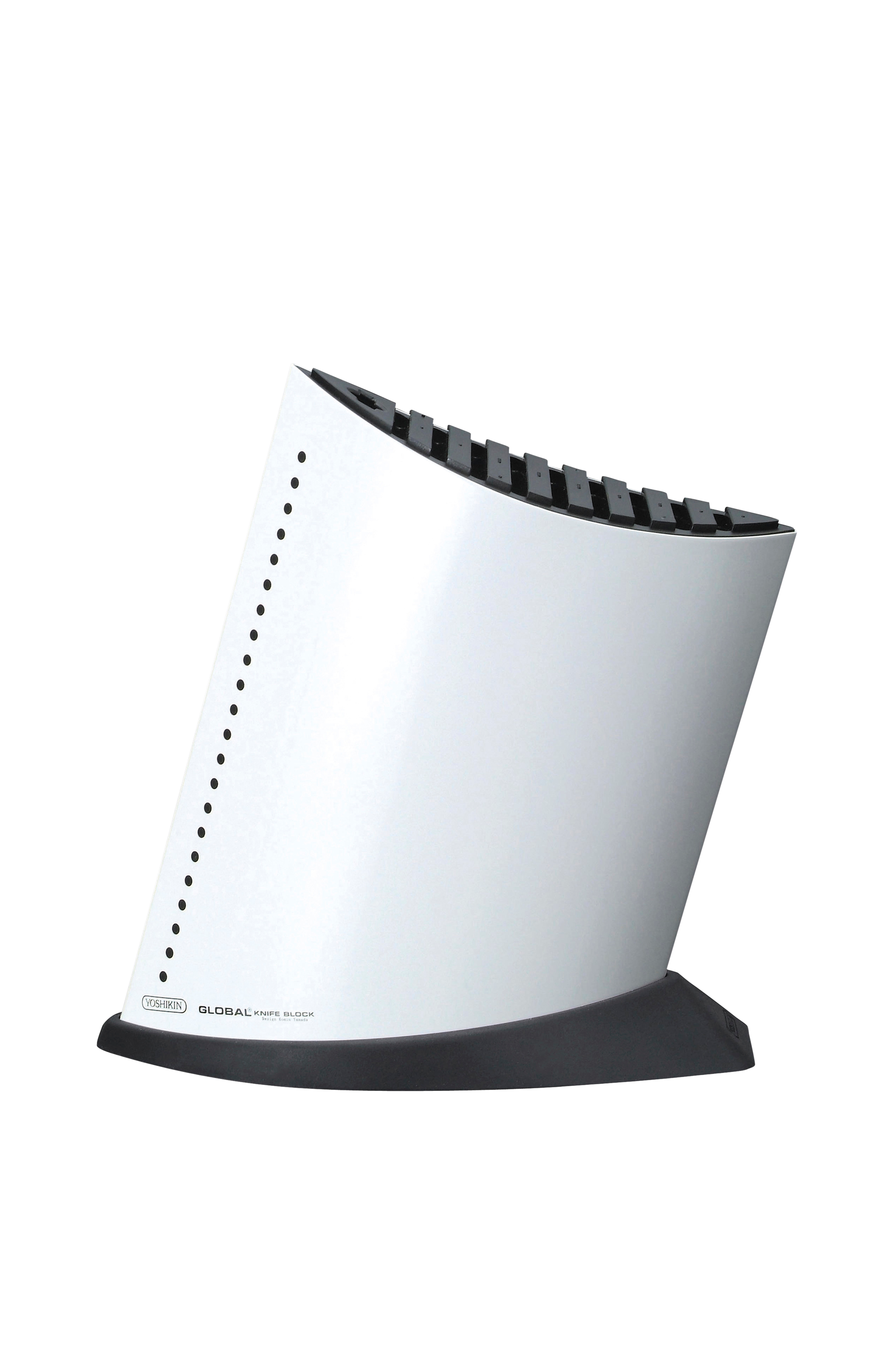 Älä laita keittiöveitsiä makuulleen aterinlaatikkoon, missä ne hankautuvat toisiaan vasten. Globalin veitsitukissa säilytät veitset turvallisesti. Tässä mallissa on tilaa yhdeksälle veitselle ja teroituspuikolle. Veitsitukki sopii veitsille, joiden terän pituus on enintään 28 cm.