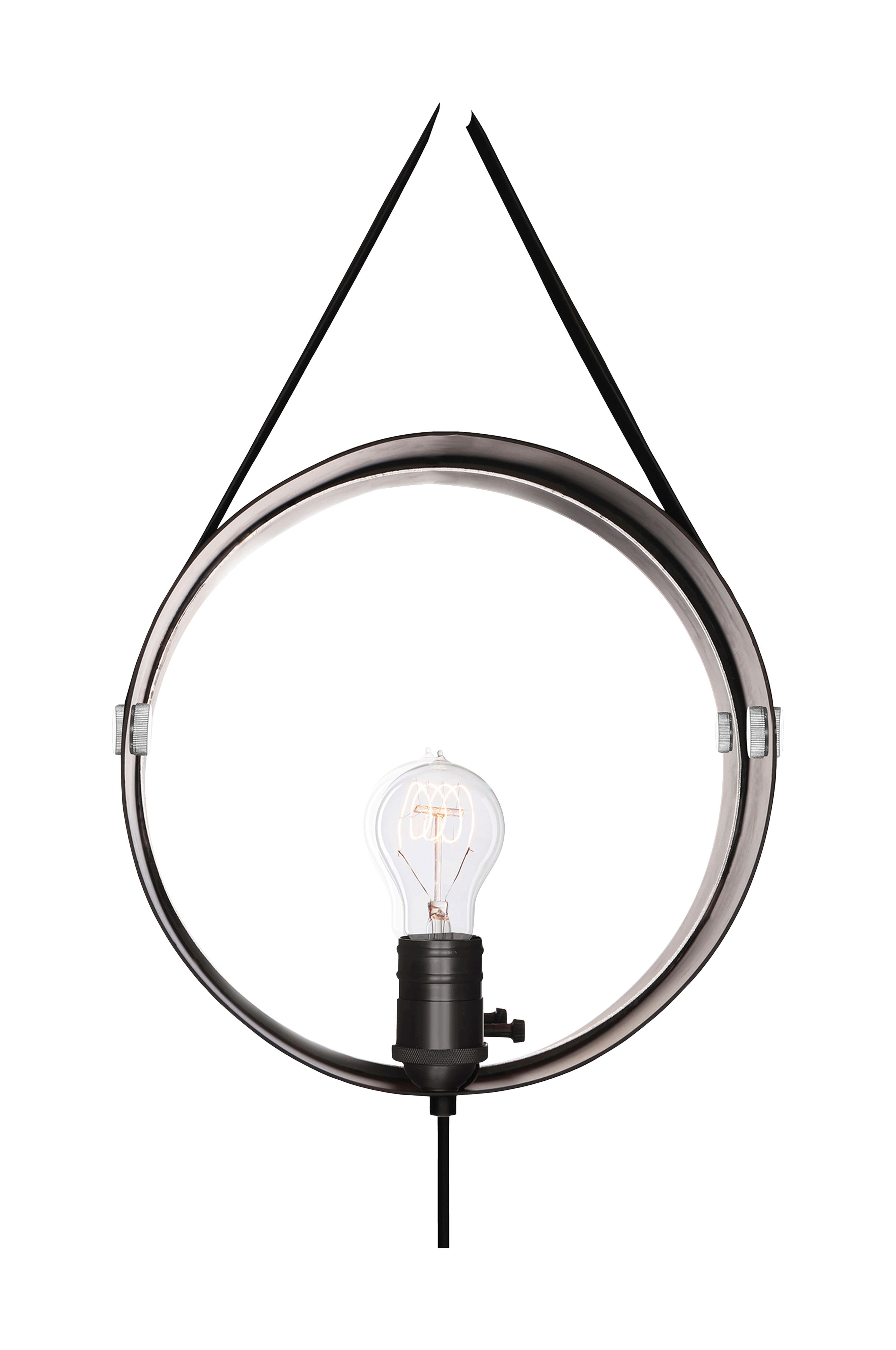Hangover-seinävalaisin on kuin metallikehyksinen peili. Detaljit vasikannahkaa ja harjattua messinkiä. Lampunkannassa kierrettävä kytkin. Sointuvansävyinen kangaspäällysteinen johto. Halkaisija 35 cm. Syvyys 6 cm. Lampunkanta E27. Enintään 60 W. Design: Patrick Hall.