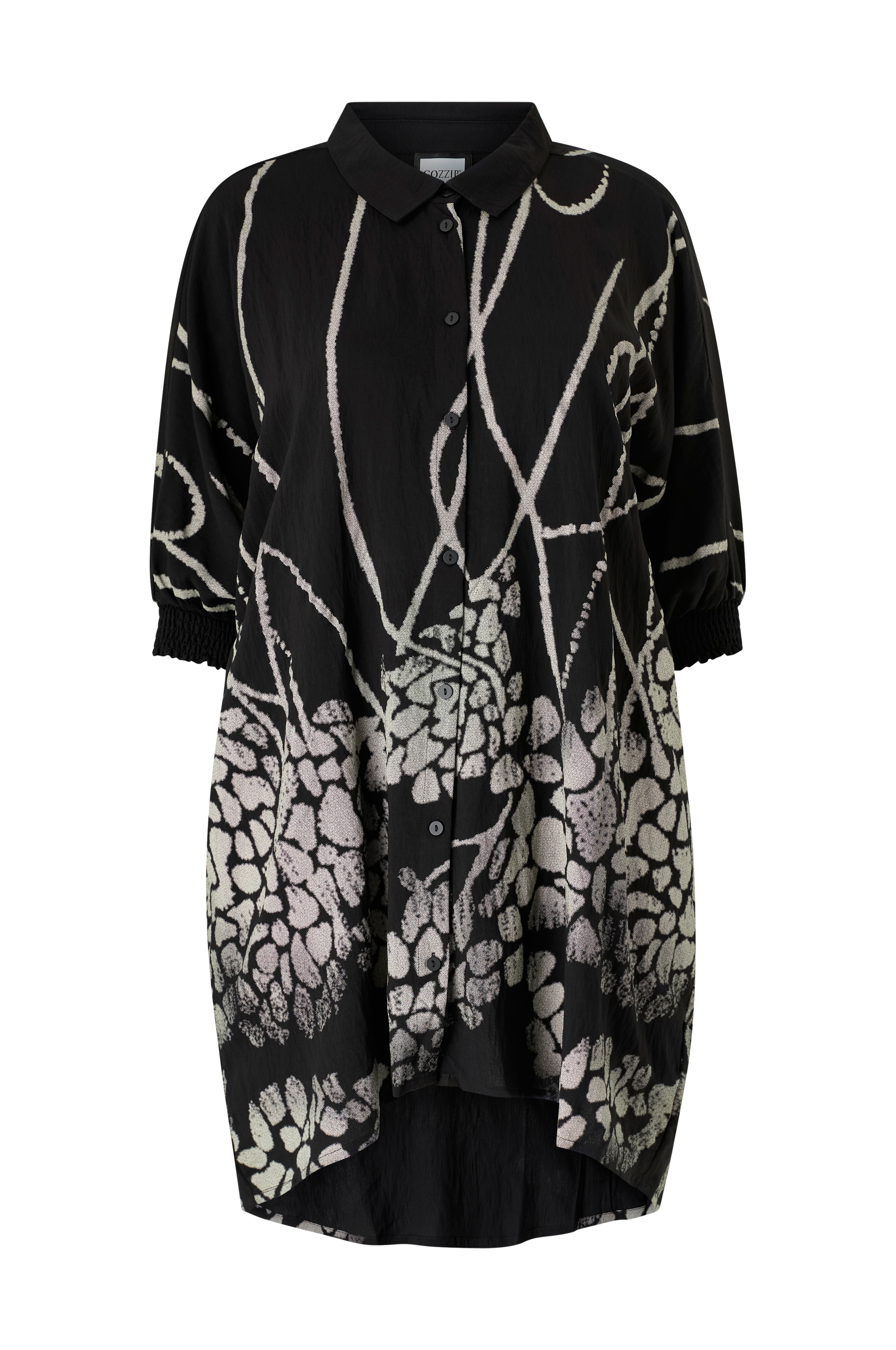 • Tunika löysällä, rennolla istuvuudella• Kaulus• Napit suoraan eteenpäin• 3/4-pituiset hihat rypytyksellä hihansuissa• Hieman pidempi takaosa• Pyöristetty helma• Plus-koot• Pituus: 106 cm koossa S