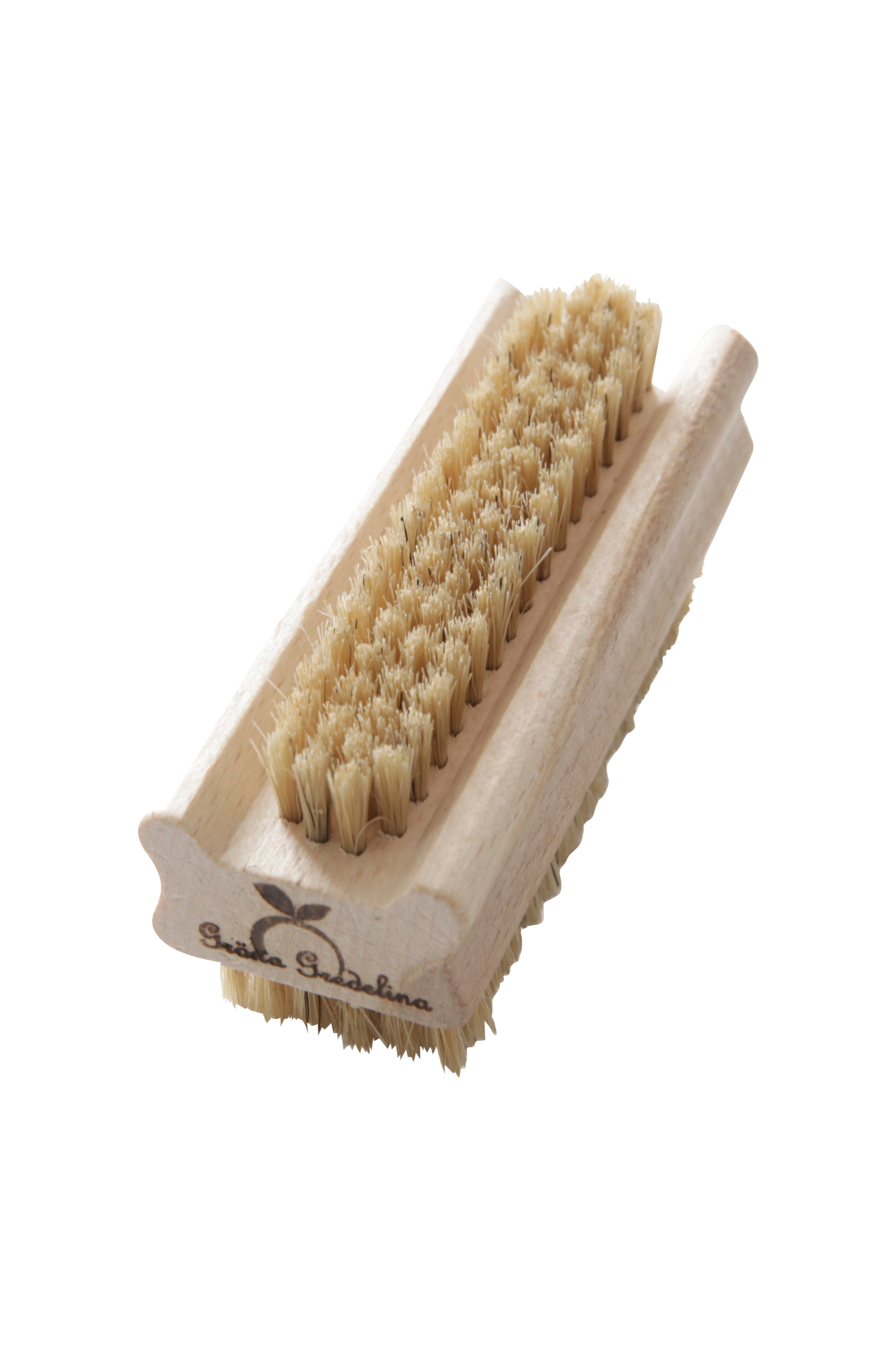 Kynsiharja puuta ja jouhea. Kynsiharjalla pidät helposti kynnet ja kynsinauhat puhtaina. Jouhiharjan antama hieronta saa kynsinauhat voimaan hyvin. Kynsiharjan toisella puolella on pehmeä jouhi. Tuotteen käyttö: Kostuta kätesi saippualla ja vedellä. Harjaa kiertävin liikkein kynnen päällä ja viistoin liikkein kynnen alla. Huuhtele kynsiharja lopetettuasi ja anna kuivua käytön välissä. Puu on pehmeää ja sileää. Kynsiharjasta tulee hieno yksityiskohta kylpyhuoneeseen. Polttoleimattu Gröna Gredelina -logo.