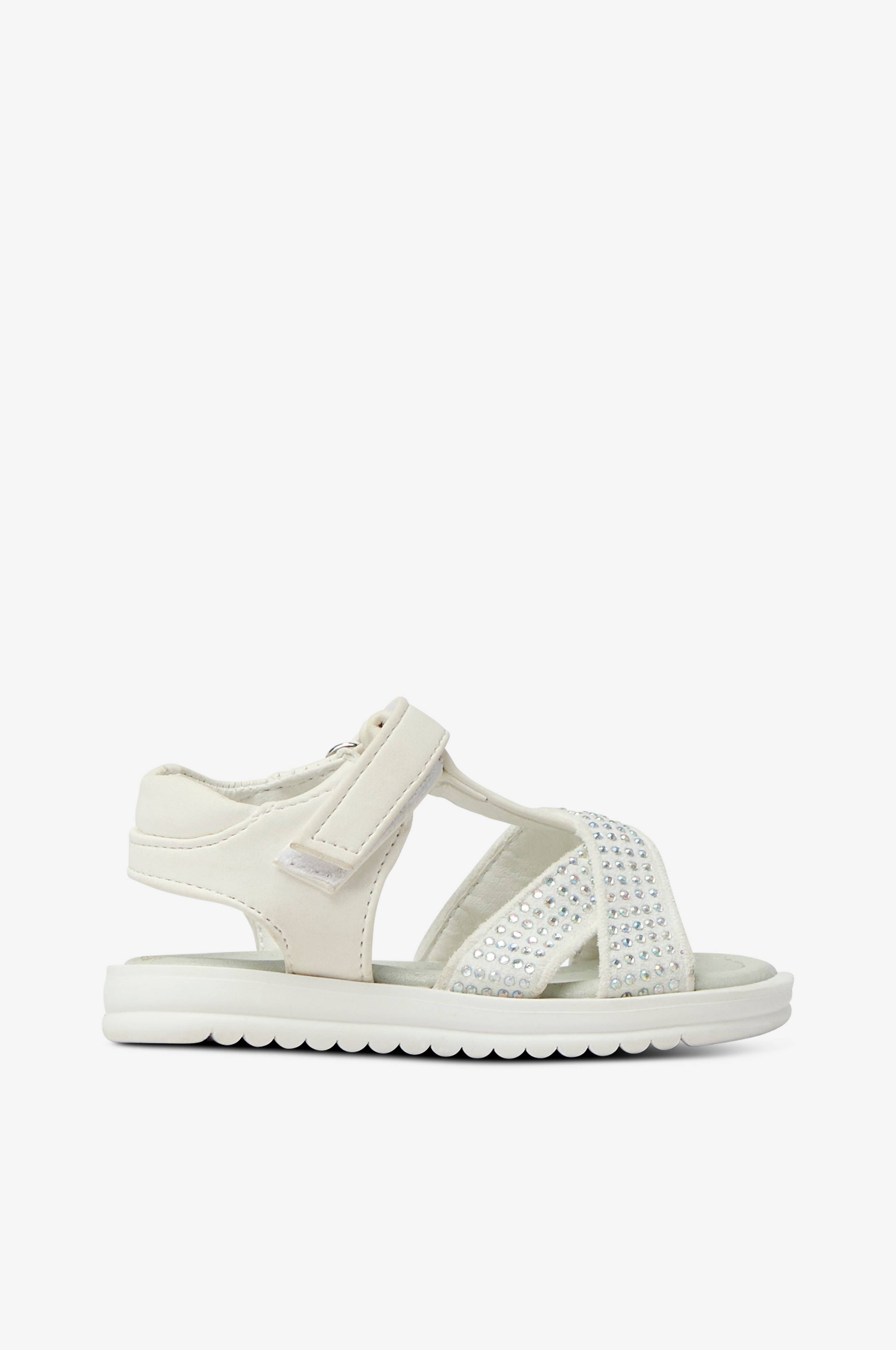 Sandaalit pehmeää, kimaltavaa nahkajäljitelmää. Etummaisissa remmeissä strassikiviä. Pitkä, säädettävä nilkkaremmi, jossa tarranauha. Pehmustettu kantakuppi. Uurrettu ulkopohja.