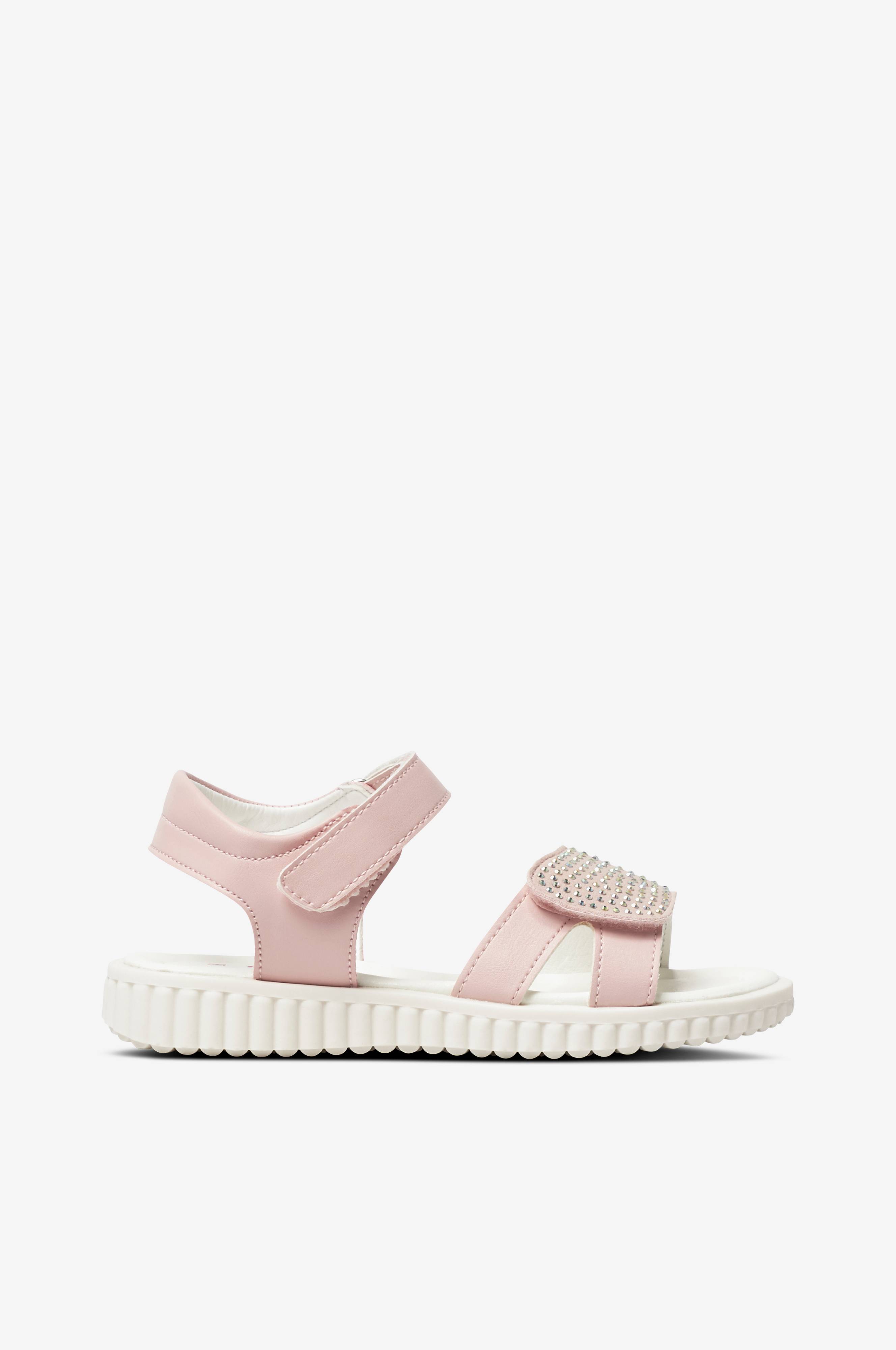 Sandaalit nahkajäljitelmää. Kaksi säädettävää tarranauhallista remmiä. Leveämmässä remmissä on kimaltavia koristekiviä. Ulkopohja kumia.