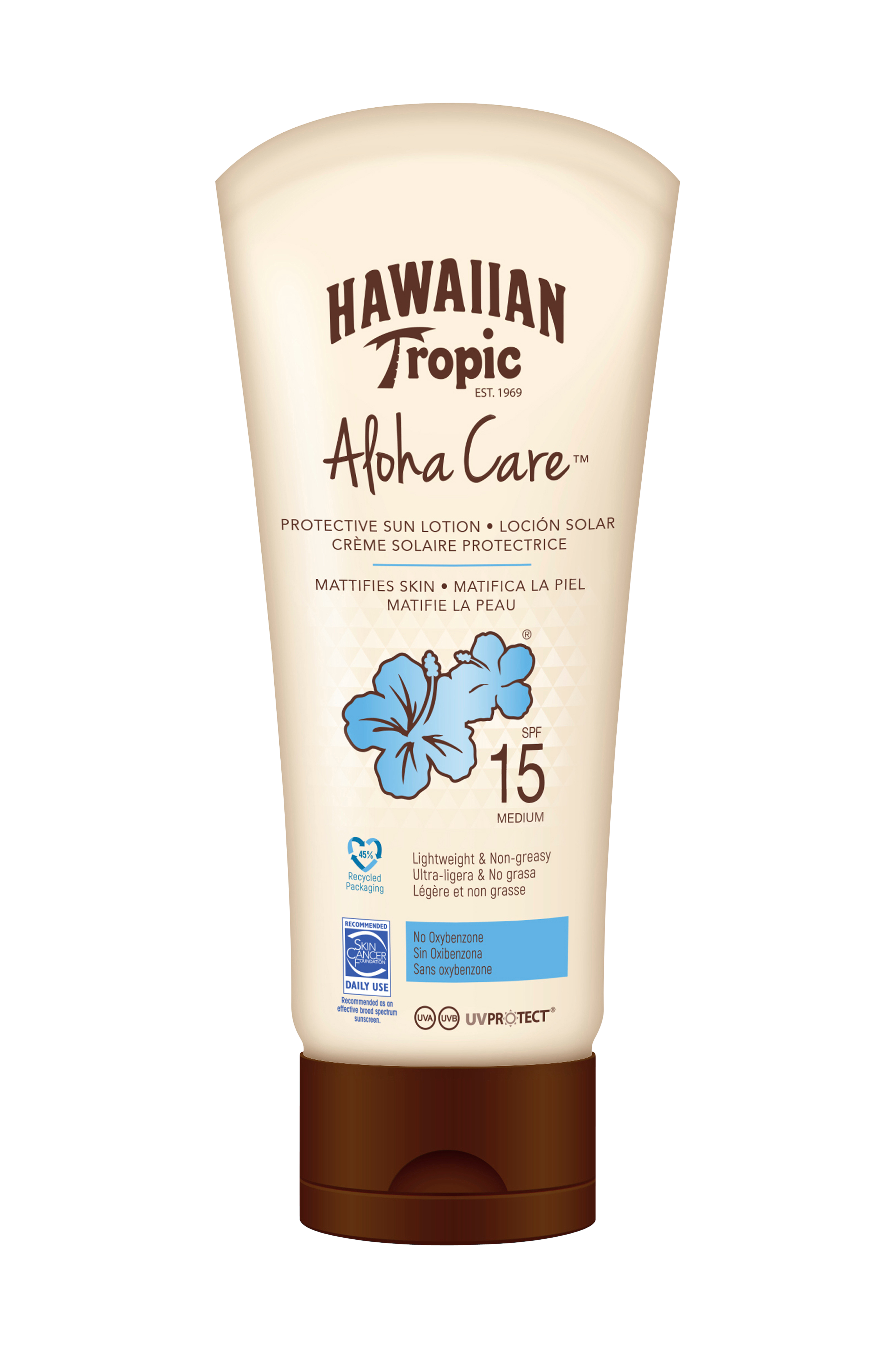Aloha Care Lotion, jossa on suojakerroin 15, on kevyt ja nopeasti imeytyvä aurinkosuoja, joka jättää mattapinnan. Suojaa tehokkaasti auringolta ja UVA/UVB-säteiltä. Imeytyy helposti ihoon tahraamatta. Klassinen ja eksoottinen Hawaiian Tropic -tuoksu. Tuote on dermatologisesti testattu ja SCF-hyväksytty sekä Skin Cancer Foundationin suosittelema.