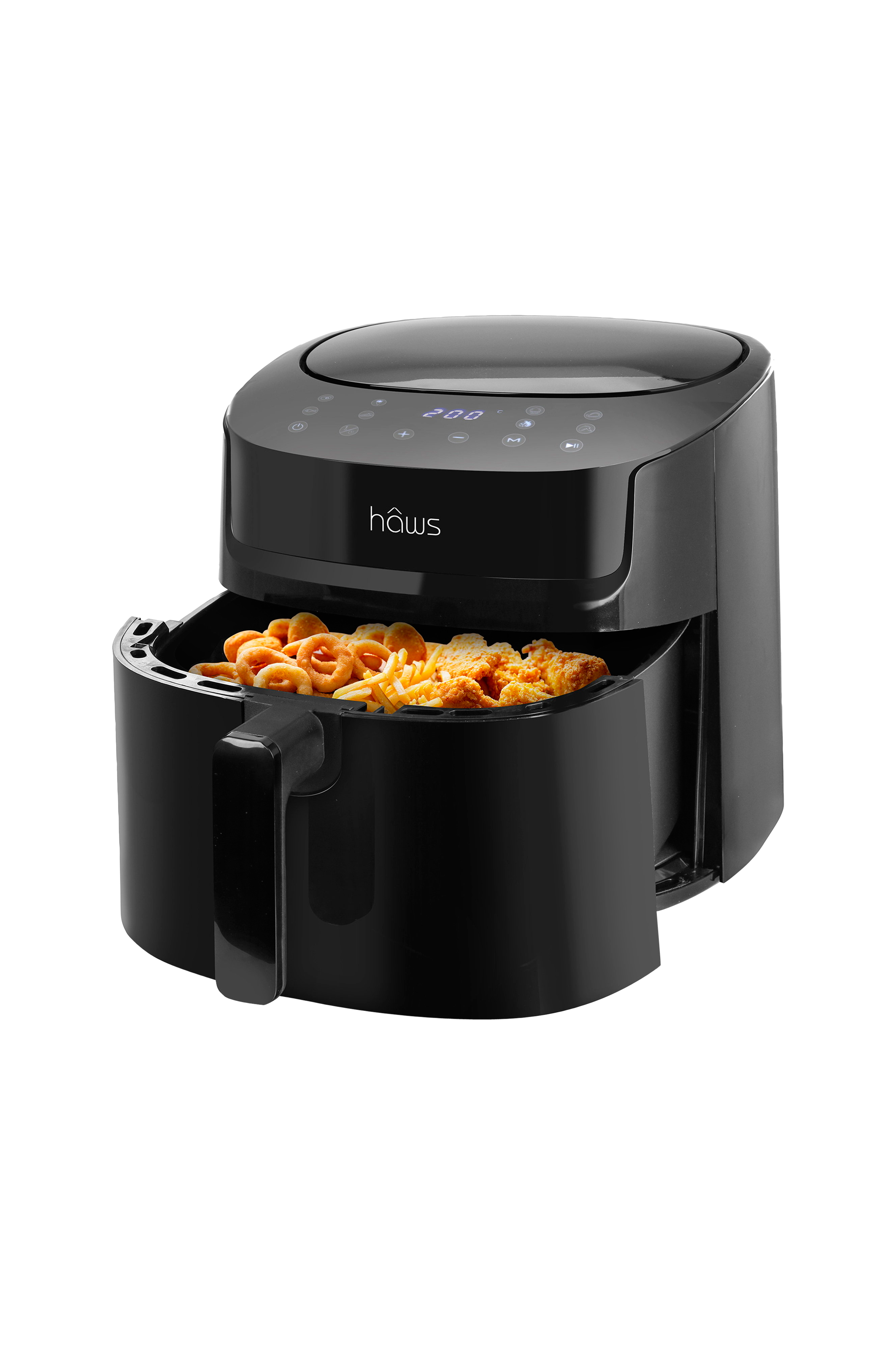 Hâws-ilmankuivaimella voit valmistaa helposti rapeaa ja mehukasta ruokaa ilman korkeita kaloreita ja suuria määriä öljyä. Ilma kiertää ilmankuivaimessa nopeammin, joten kypsennysaika on perinteiseen uuniin verrattuna lyhyempi. Lyhennetty kypsennysaika voi säästää sähkölaskussa. 7,5 litran tilavuuden ansiosta voit valmistaa suuria annoksia suosikkiruokia perheellesi tai ystävillesi hetkessä. Cool touch -kahvan ansiosta laatikkoa on helppo ja turvallinen käsitellä kypsennyksen jälkeen. Laatikko ja teline ovat astianpesukoneen kestäviä, joten ne on helppo puhdistaa. Voit säätää lämpötilan (50-200°) mieleiseksesi säädettävällä termostaatilla ja suunnitella aterioita ajastintoiminnolla tai käyttää jotakin 10 esiasetetusta ohjelmasta. Kun ruoka on valmista, kuulet äänimerkin, joka varoittaa ruoan valmistumisesta. Liukumattomilla jaloilla varustettu laite seisoo tukevasti ja vakaasti keittiön pöydällä. Friteerauskoneessa on kaksinkertainen lämmityselementti, joten se lämmittää sekä ylä- että alapuolelta lämmön entistäkin paremman jakautumisen vuoksi. Pinnoite on ilag ja se on pfas-vapaa.
