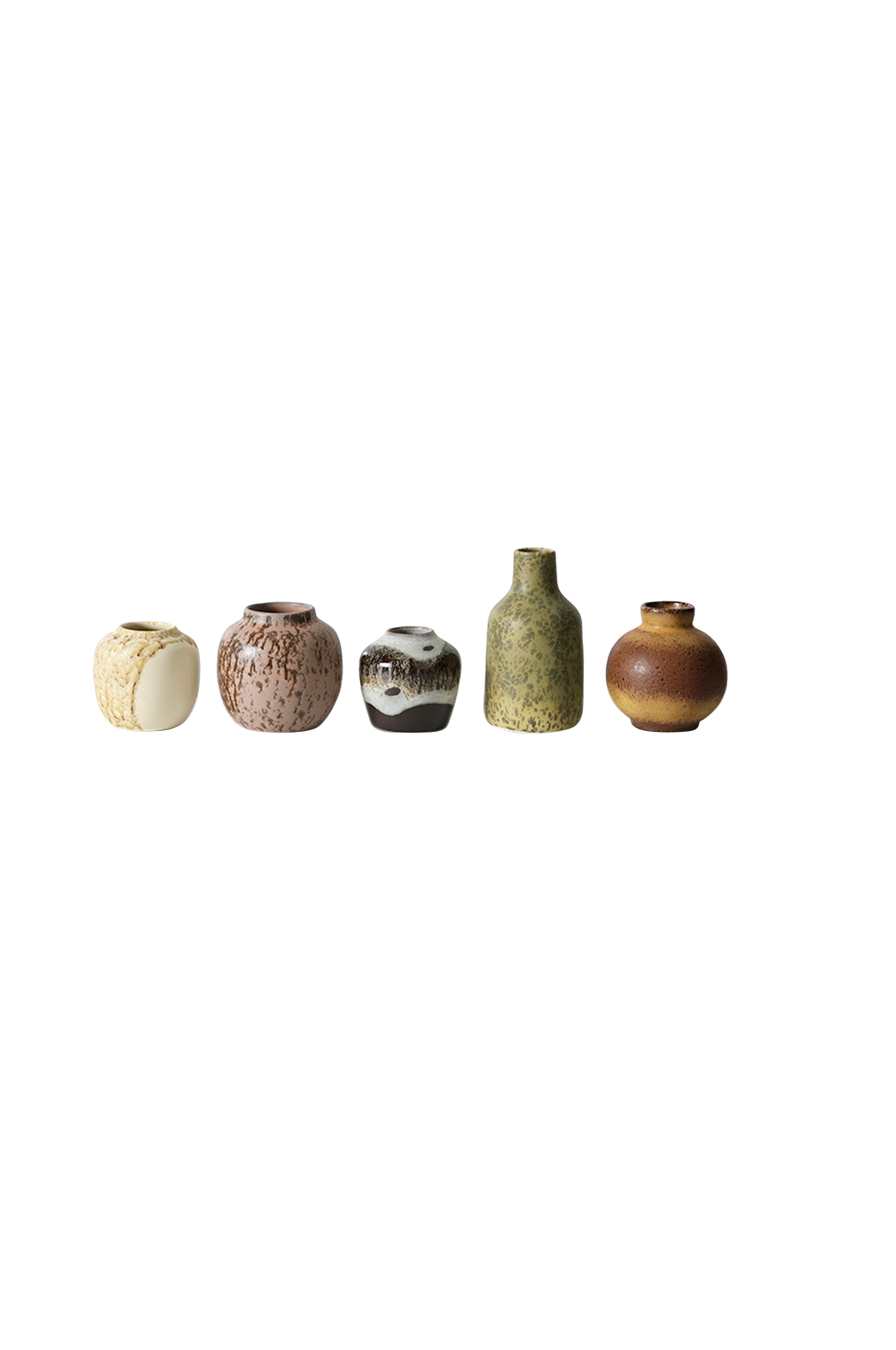 Lisää kotiisi ripaus retrohenkistä charmia tällä 5 keraamisen maljakon sarjalla, joka on suosikki ikonisesta 70-luvun keramiikkamallistostamme. Jokaisessa maljakossa on ainutlaatuinen muoto ja käsin viimeistelty lasite, mikä tekee jokaisesta kappaleesta todella ainutlaatuisen. Tämä setti on täydellinen yksittäisten kukkavarsien esillepanoon tai yksinkertaisesti koristeeksi, ja se tarjoaa loputtomasti muotoilumahdollisuuksia tuoden samalla lämpöä ja luonnetta mihin tahansa sisustukseen. Mitat: 7,2-9x7,5-13,3 cm.