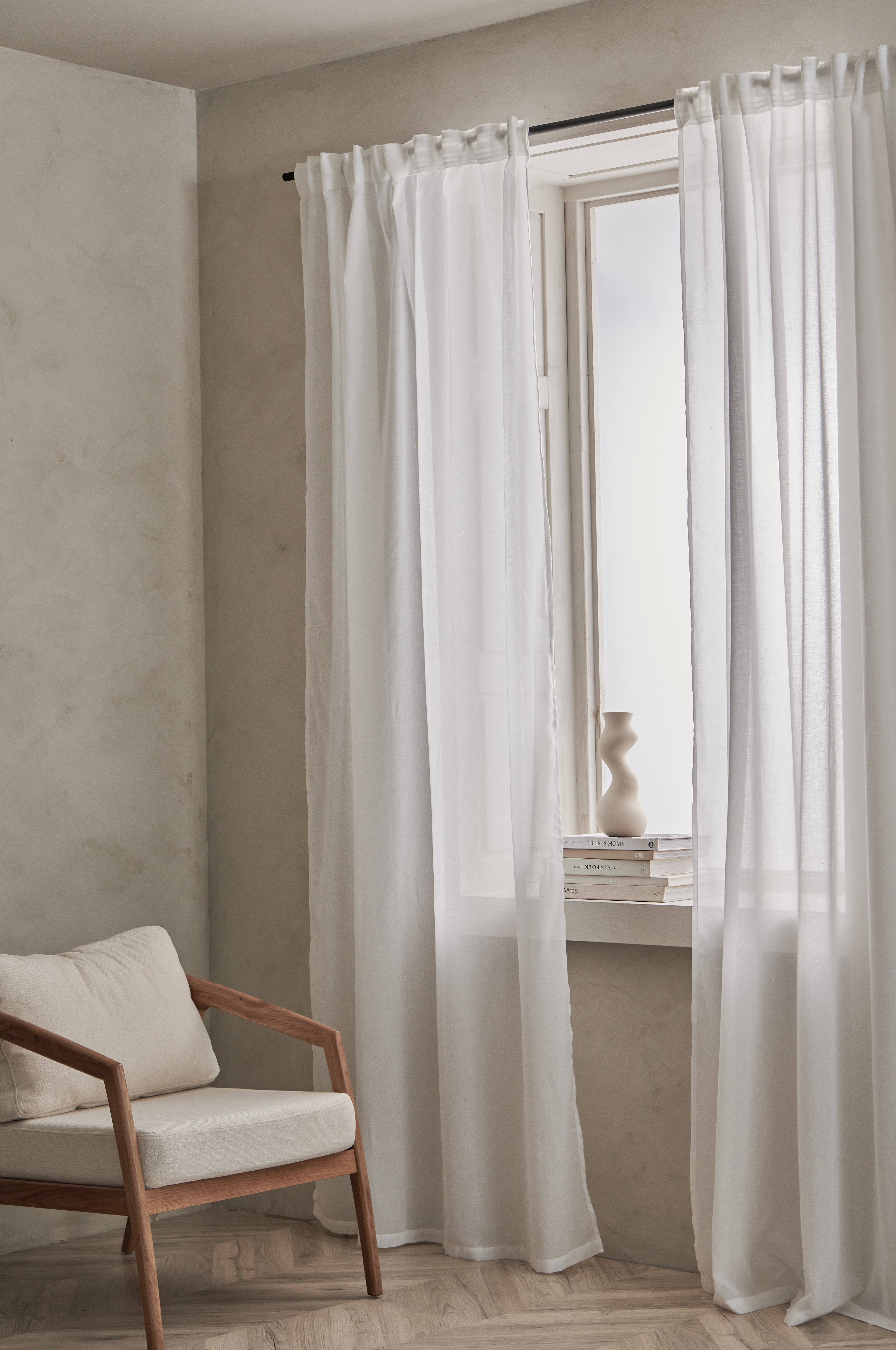 Kaksi monitoimiverhoa pehmeää ja läpikuultavaa materiaalia kierrätetystä polyesteristä. Monitoiminauhan ansiosta verhot voidaan ripustaa piilolenkkien avulla suoraan verhotankoon tai käyttää ripustamiseen renkaita, neulakoukkuja tai sormikoukkuja. Poimutusnauhan nyöreillä saat helposti tasaiset ja kauniit laskokset.