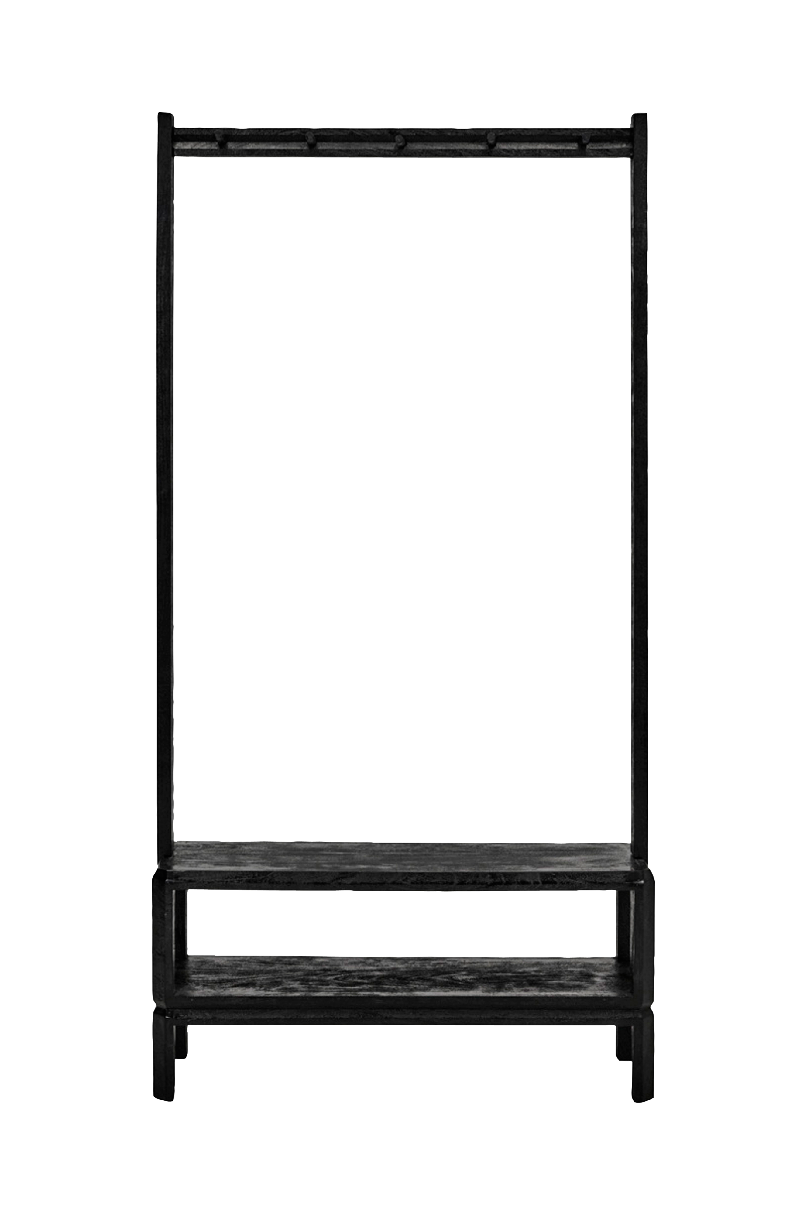 Paranna eteistäsi tai makuuhuonettasi vaateripustimella, joka yhdistää toimivuuden ja persoonallisuuden. Käsintehty harjatusta mustasta mangopuusta valmistettu ripustin on näyttävä ja siinä on viisi koukkua kummallakin puolella sekä kaksi hyllyä kenkiä, koreja tai laukkuja varten. Paksu, ainutlaatuinen muotoilu huokuu boheemia tyyliä ja pitää päivittäiset tarvikkeet kauniisti järjestyksessä. Esittele suosikkikorejasi tai laukkujasi hyllyillä ja anna silmiinpistävän siluetin lisätä vaivattomasti luonnetta asuintiloihisi.
