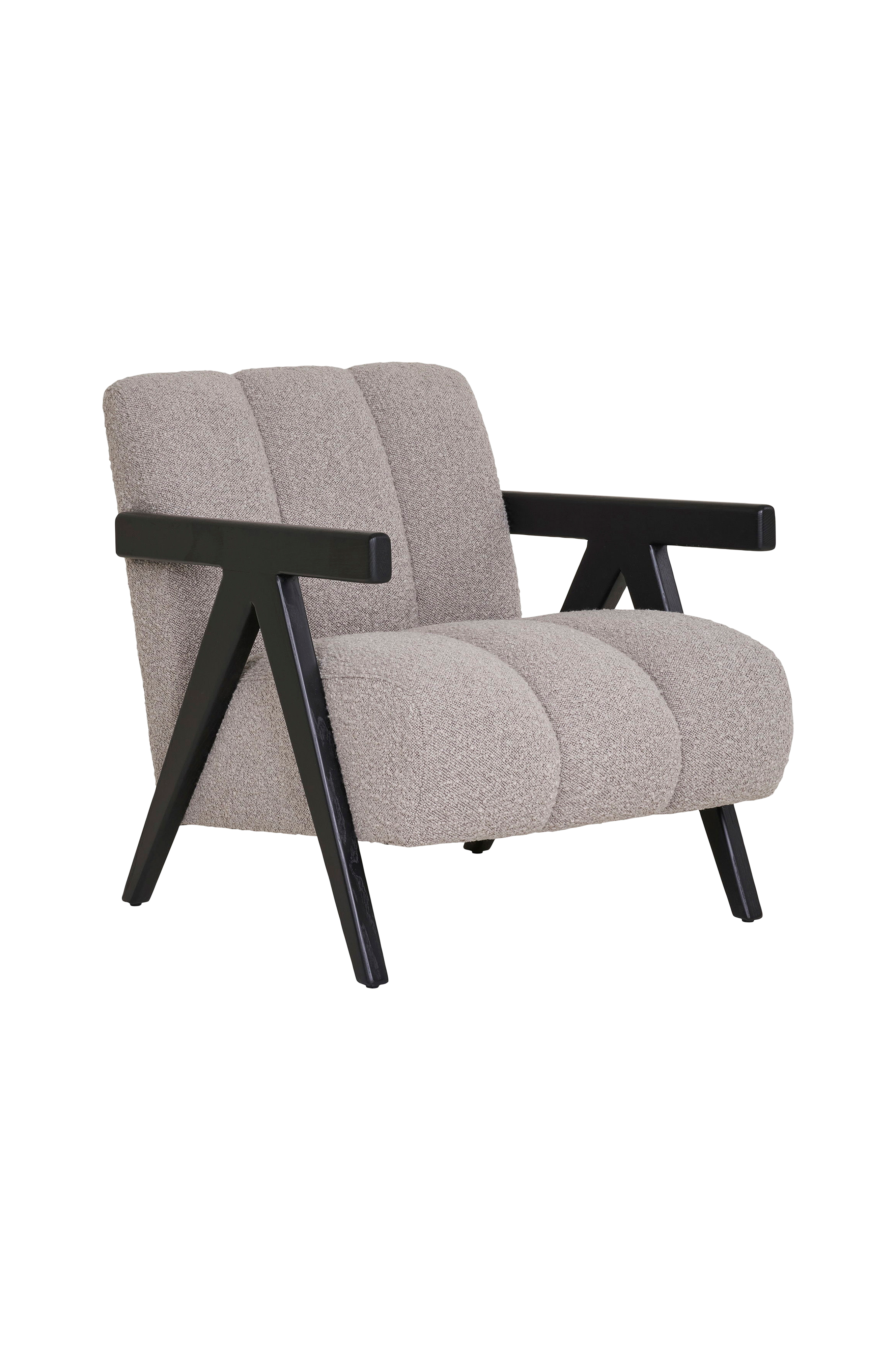 Lounge-tuoli, jossa on pehmeä polyesteriverhoilu ja tukevat puujalat.
