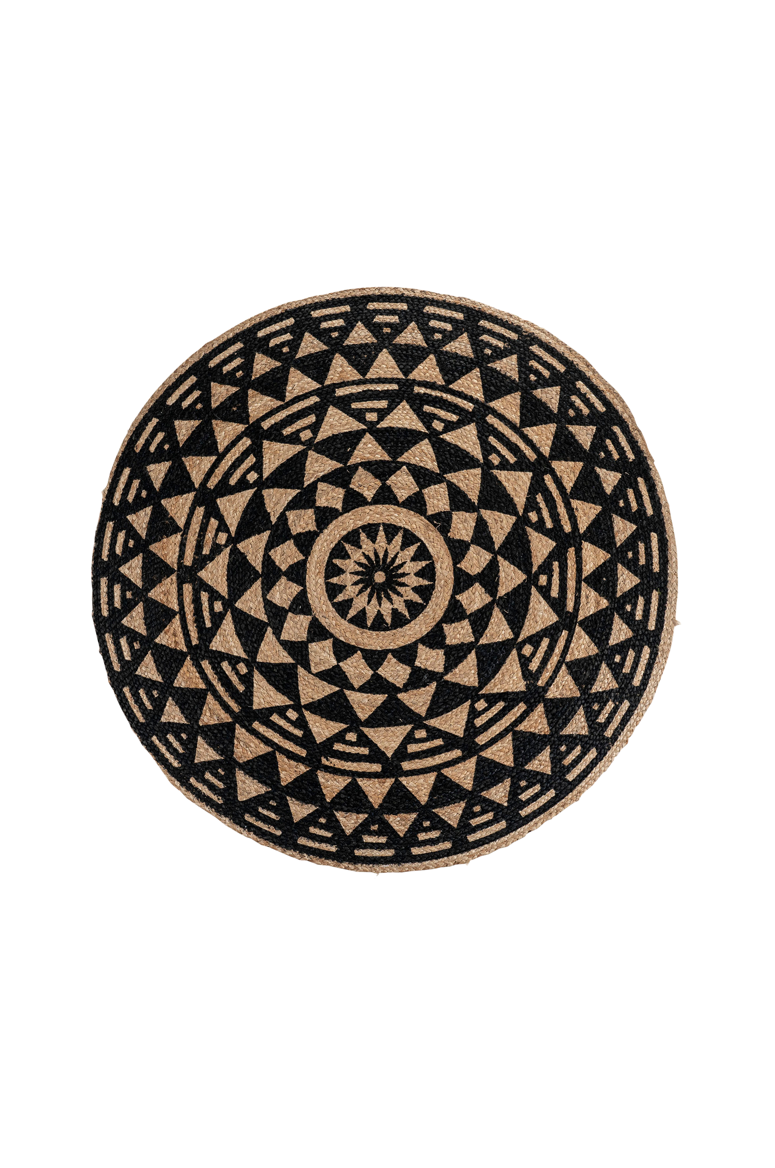 Pyöreä matto luonnonväristä juuttipunosta mustin painatuksin