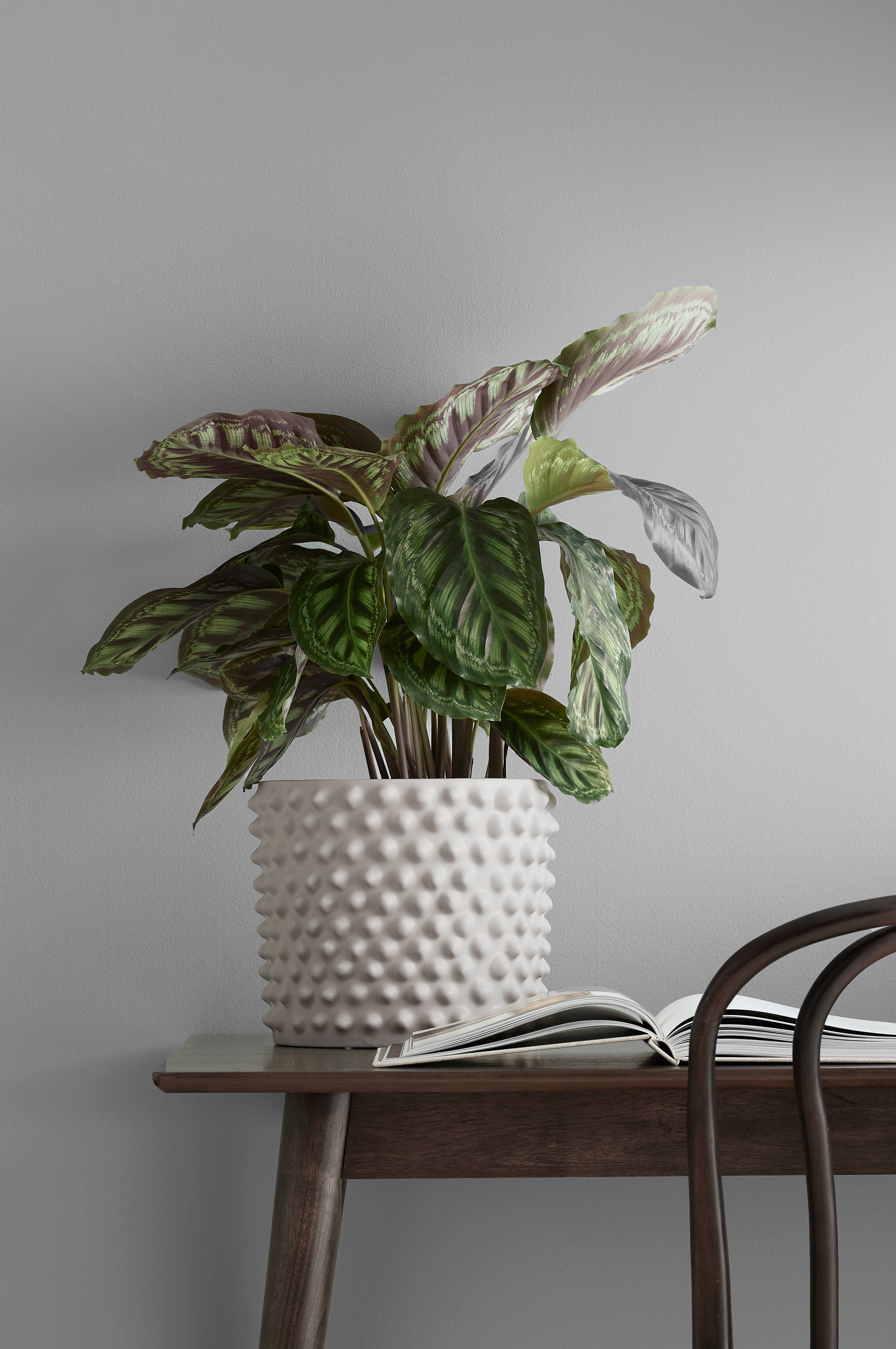 Calathea-suvussa on paljon kuvioita, värejä ja muotoja. Kasvi viihtyy valoisassa tai puolivarjoisassa paikassa, vältä suoraa auringonvaloa. Pidä multa hieman kosteana, mutta ei märkänä. Muovinen sisäruukku, jonka halkaisija 19 cm.