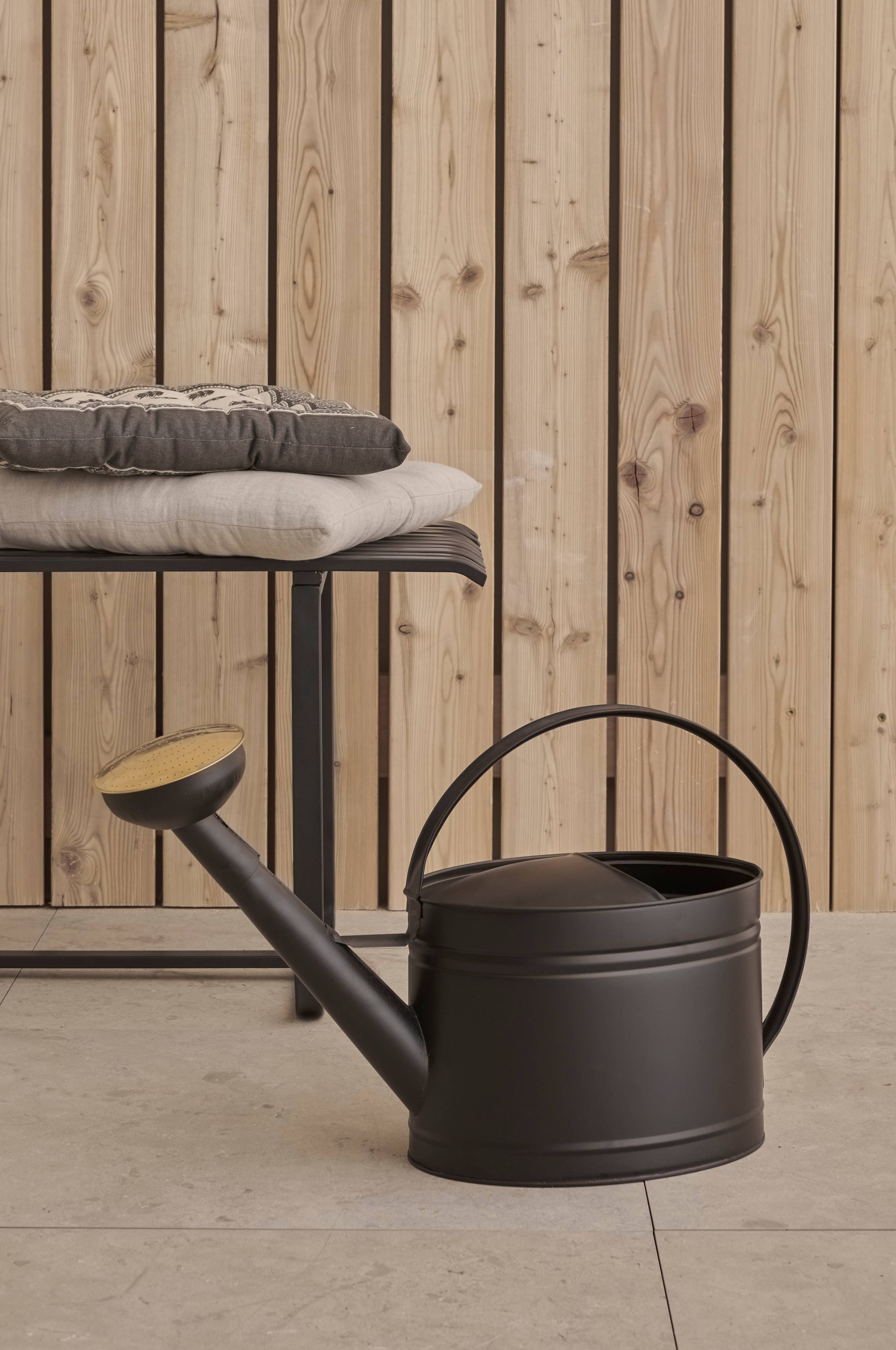 Koristeellinen, soikea ja mattamusta kastelukannu. 10 litraa, suutin