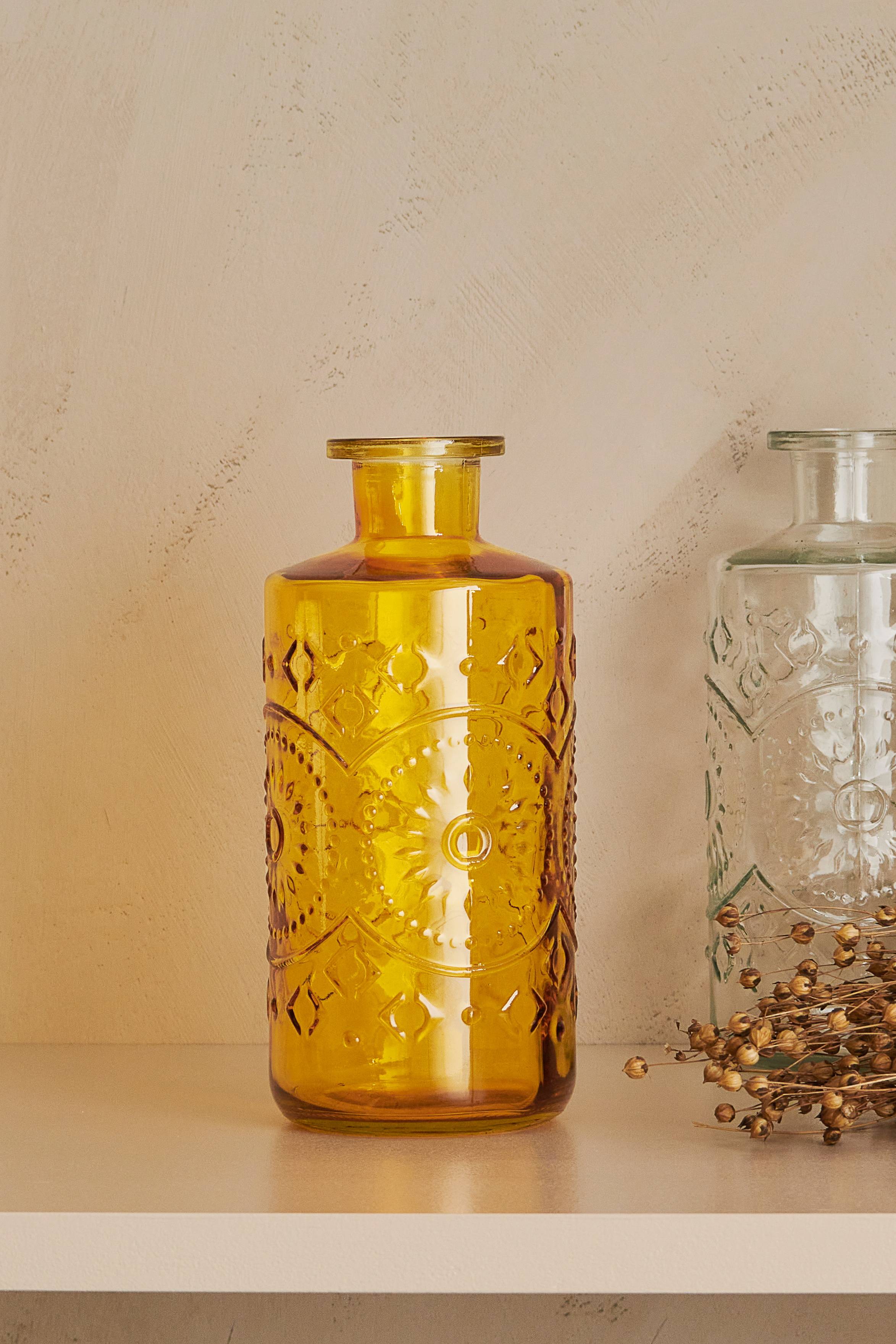 Koristekuvioitu ruskeasävyinen pullo. Ei kestä konepesua. Korkeus 21 cm, halkaisija 9 cm.