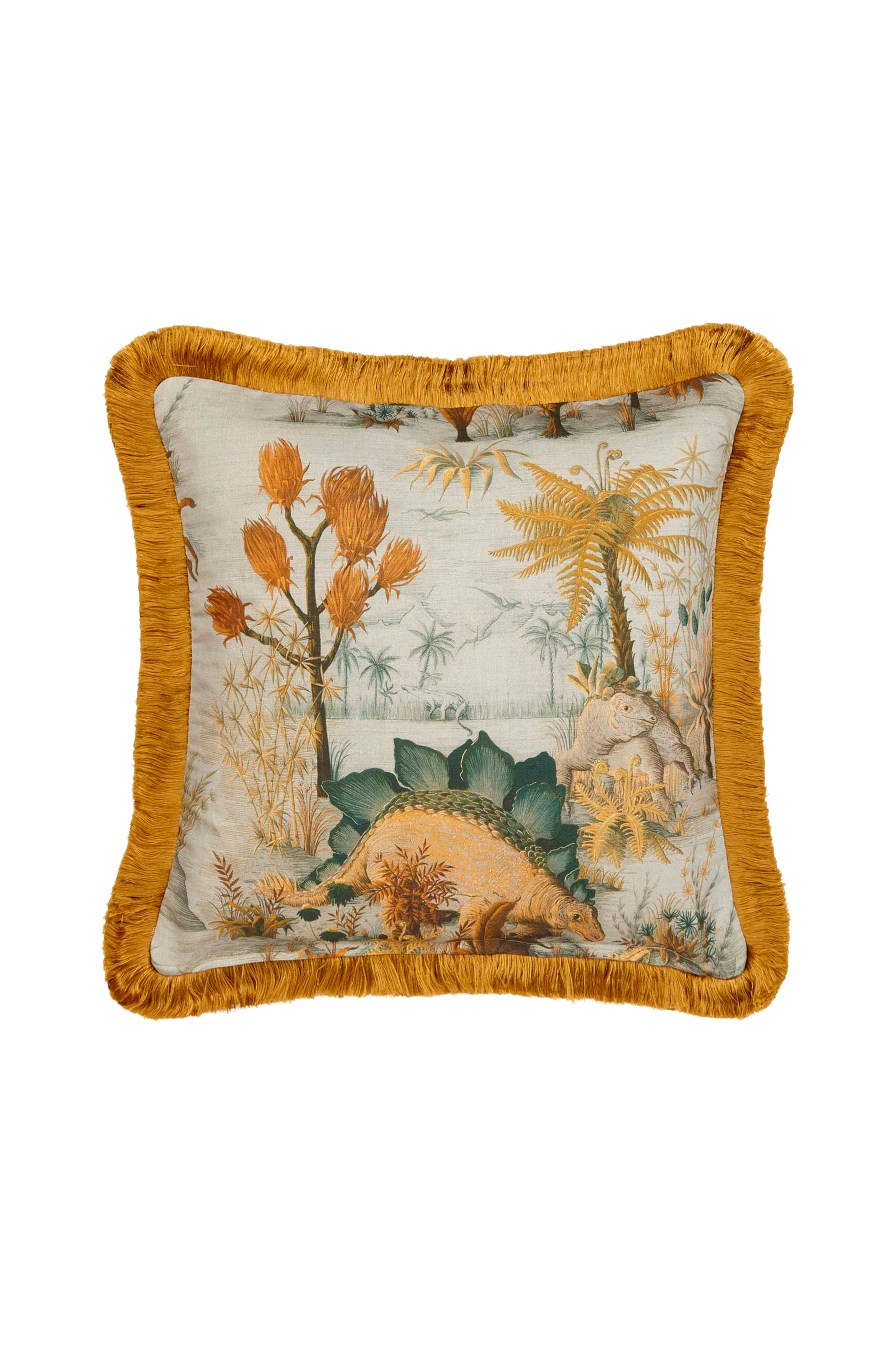 Piristä sohvan ilmettä luonteikkaalla Dinosauria-tyynyllä. Englantilaisesta puuvillapellavasta valmistettua tyynyä reunustavat hauskantuntuiset kultahapsut. Sisätyynyn täyte on sataprosenttista englantilaista villaa, joka ei aiheuta allergiaa ja hylkii punkkeja ja bakteereita. Villa on ympäristöystävällisin täyte. Tyynyn koko 45 x 45 cm. Kemiallinen pesu.