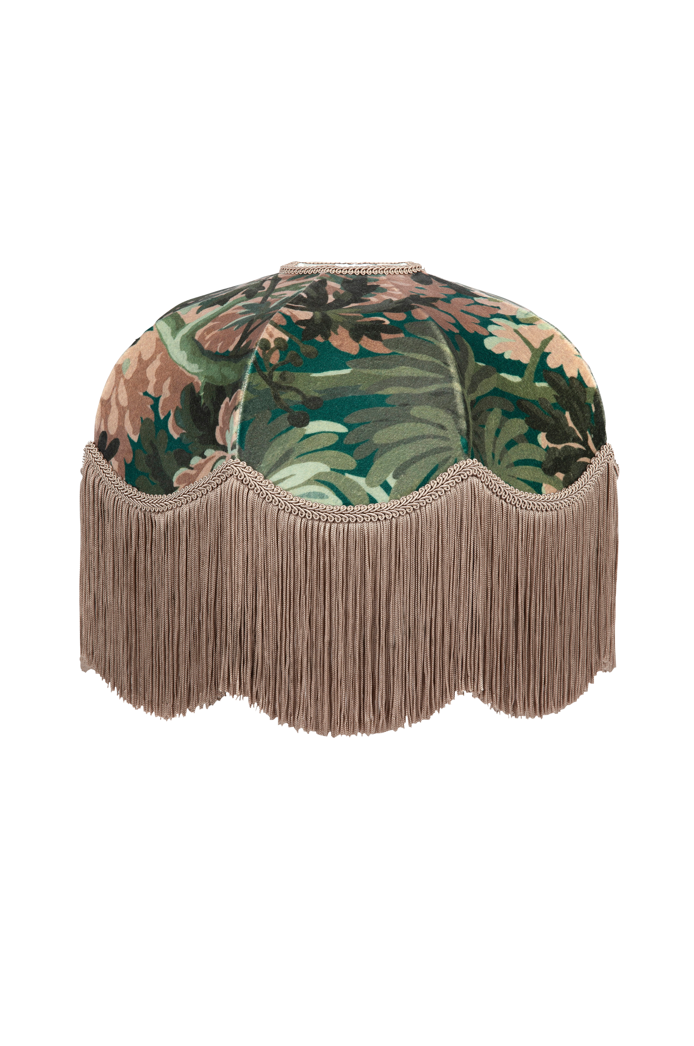 Tässä samettisessa Tilia-lamppuvarjostimessa on ikoninen viktoriaaninen muoto, ja siinä on vehreä metsäkuvio, joka kuvaa tammien muodostamaa metsikköä. Tämä kasvitieteellinen kaunotar on valmistettu käsityönä osoitteessa Uk ja viimeistelty tyylikkäällä pehmeällä ranskanharmaalla hapsulla.