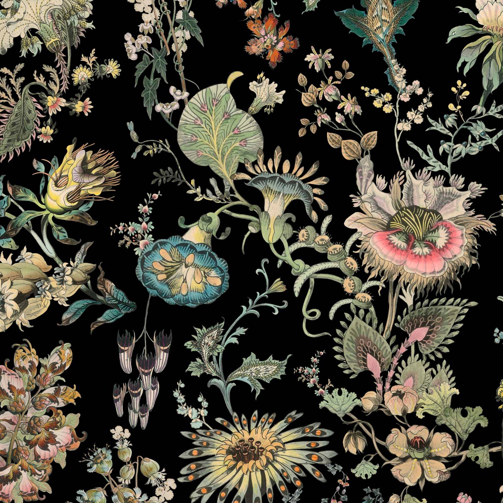 Tapetti, jossa mielikuvitukselliset kukat versovat FLORA FANTASIA -kuviossa. Maalattu kauniilla vesiväreillä tummansiniselle taustalle. Tapetti on moderni tulkinta kuviosta, joka löytyi J. Buchertin teoksesta "Fleurs de Fantaisie" - upea kirja täynnä mielikuvituksellisia kukkia 1880-luvulta. Se on niin harvinainen, että vain muutama kappale on jäljellä maailmassa. L: 180 cm x K: 300 cm. 4 vuotaa, joiden leveys 45 cm.