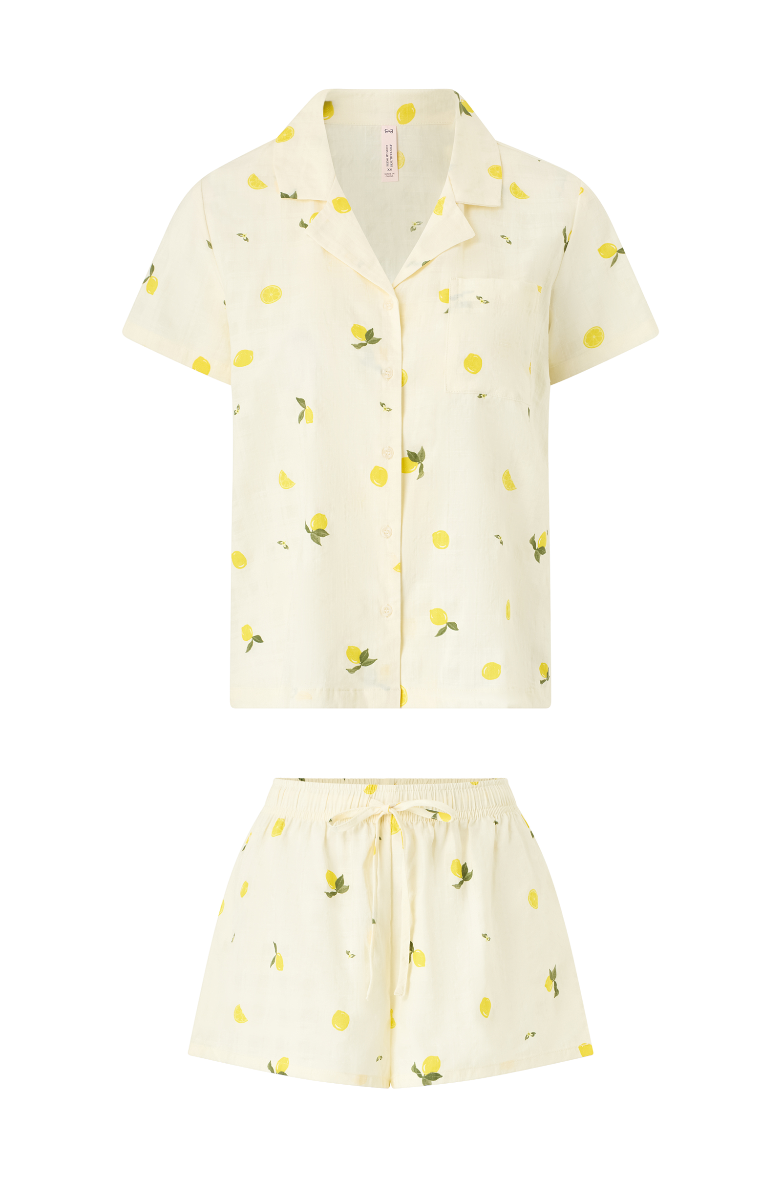 • Kaksiosainen pyjama sitruunakuviolla• Lyhythihainen paita laakakauluksella ja rintataskulla• Shortsit elastisella vyötäröllä ja kiristysnyörillä