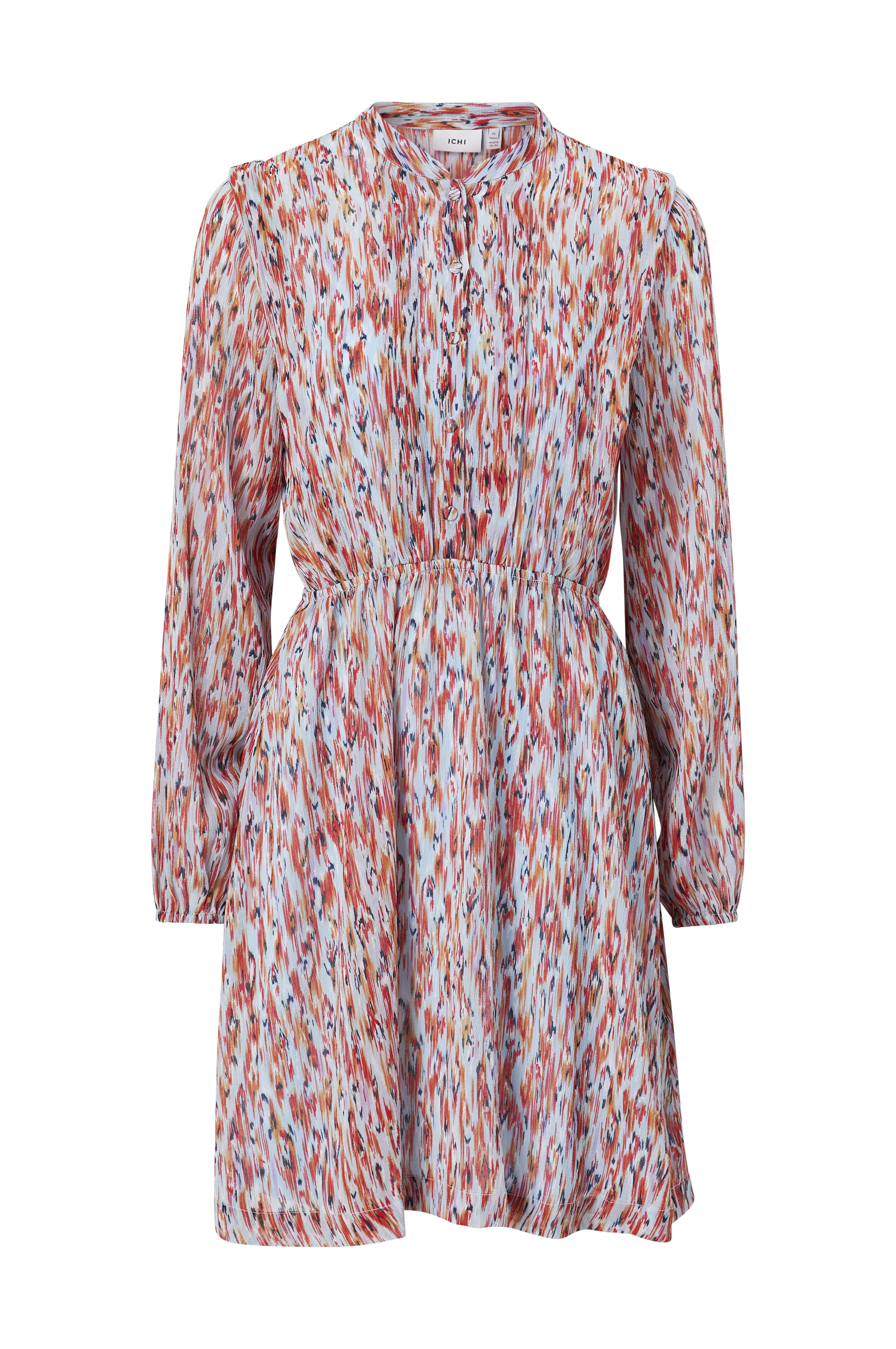 Kuviollinen mekko ohutta materiaalia. Päällystetyt napit ylhäällä edessä, joustava vyötärö ja pitkät väljähköt hihat, joissa joustavat hihansuut. Koristelaskos olkasaumoissa. Alusmekko trikoota. Pituus n. 93 cm koossa 36.