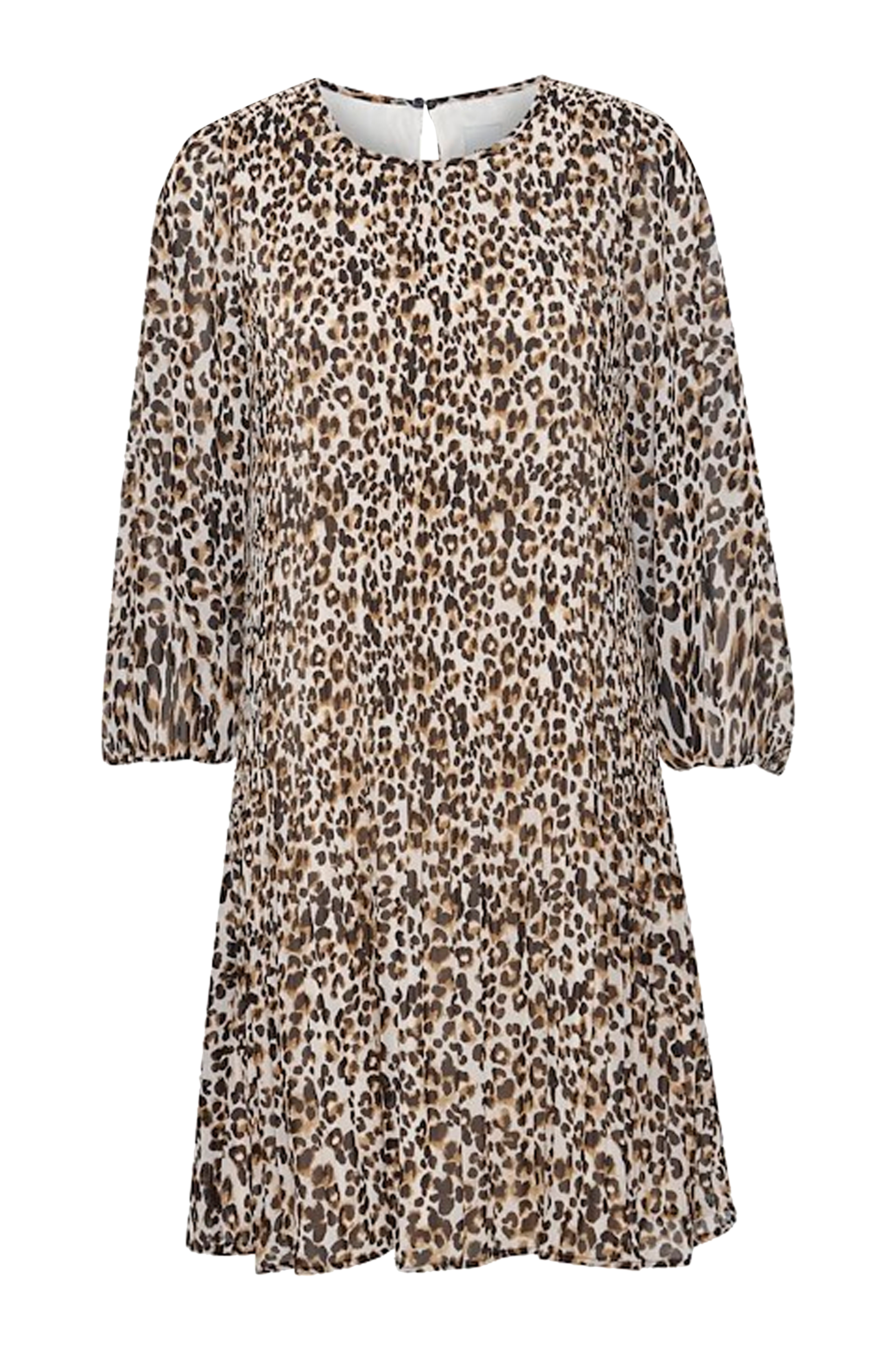 Mekko pliseerattua sifonkia. Kevyesti levenevä malli. Pussihihat, joissa joustavat hihansuut. Halkio ja nappi niskassa. Trikoovuori. Pituus n. 94 cm koossa 36.