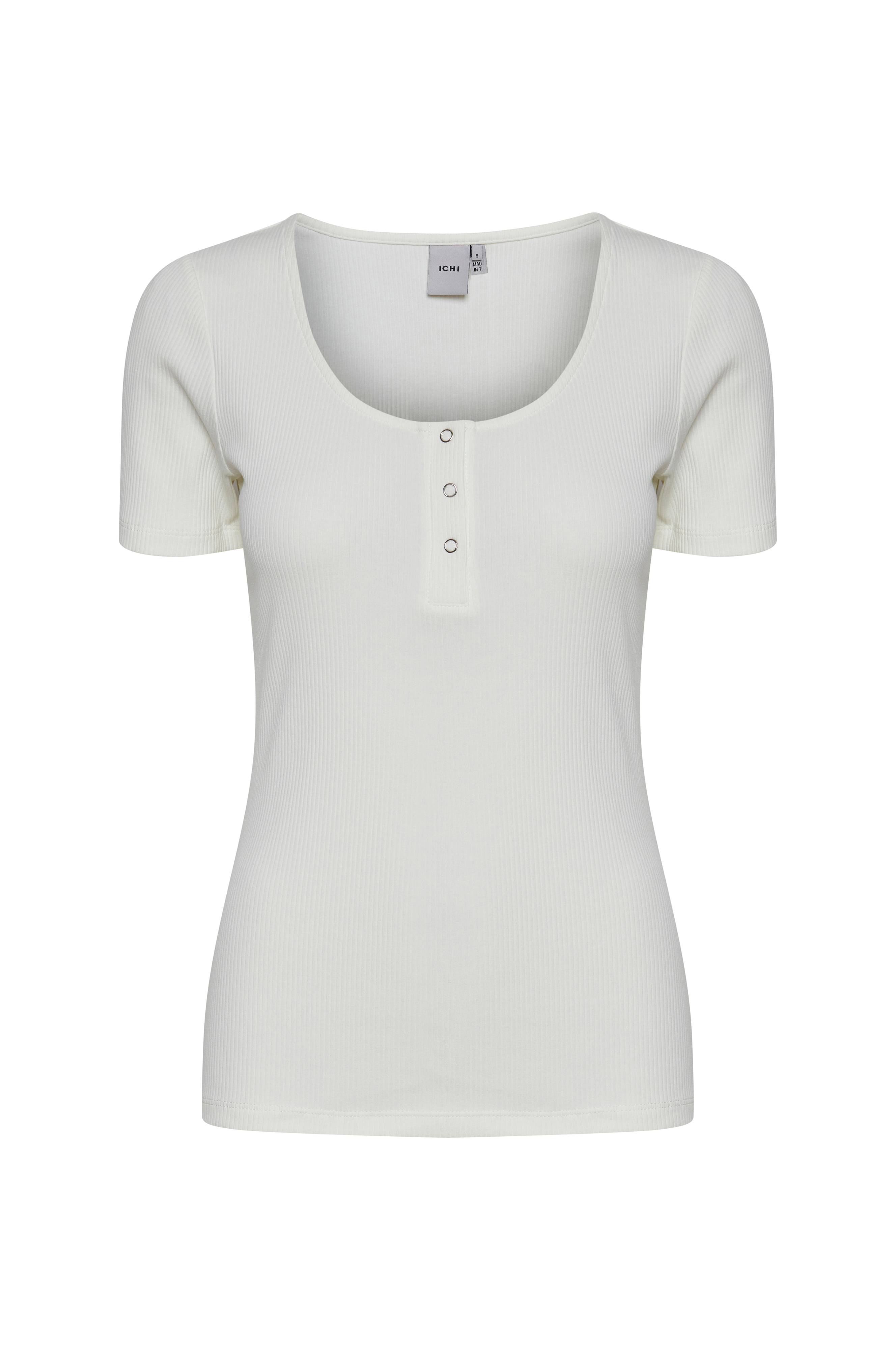 Lyhythihainen pusero, jossa kapea istuvuus. Pyöreä pääntie, jossa painonapit edessä. Joustinneulos puuvillatrikoota.