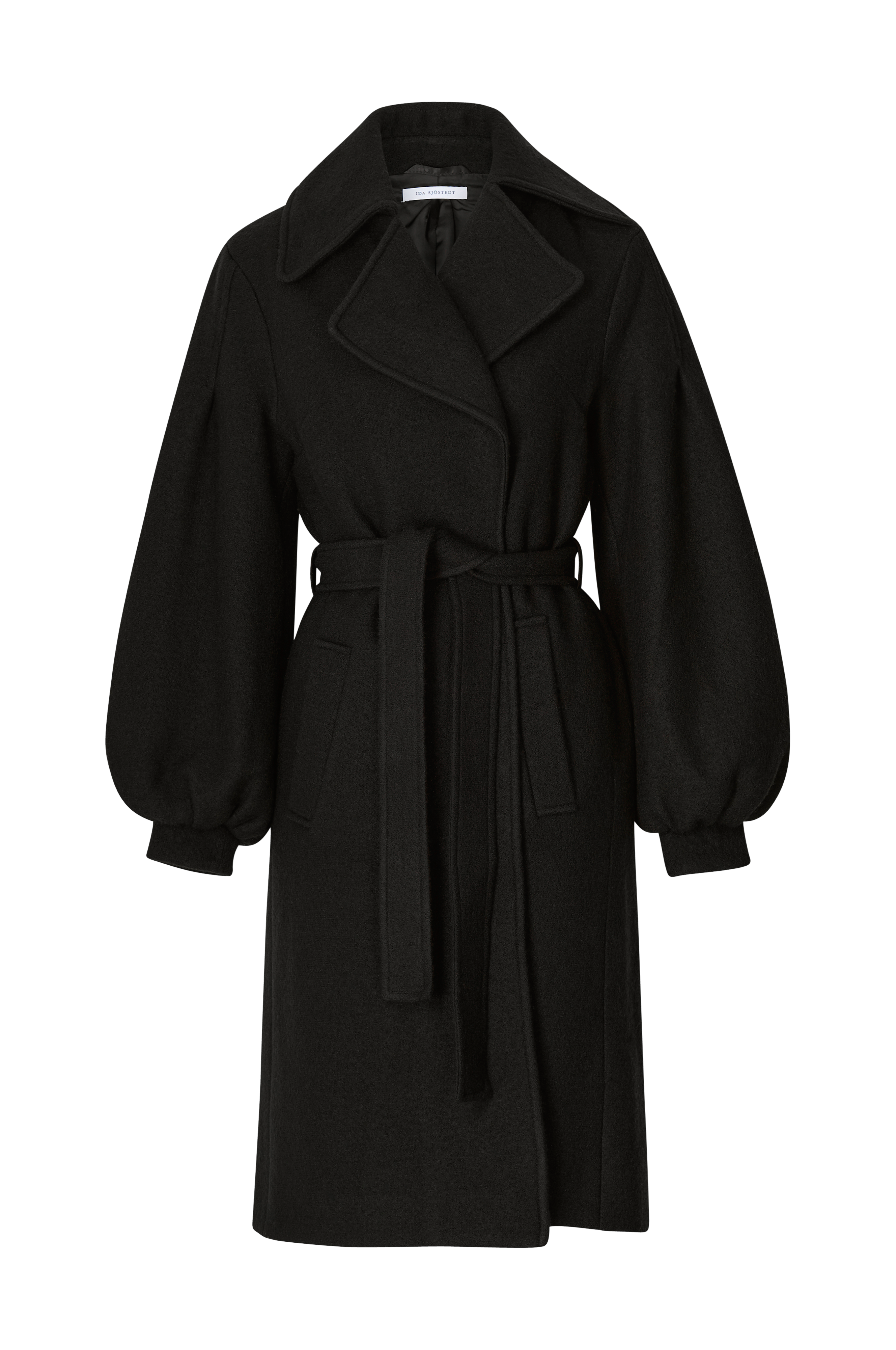 Villakangastakki, jossa kevyesti hohtava, kimaltava pinta. Pyöristetyt, naiselliset pallohihat ja ylimitoitetut käänteet. Ei nappeja. Irrotettava solmimisvyö vyötäröllä. Kaksi taskua. Halkio helmassa takana. Pituus 109 cm koossa 36.