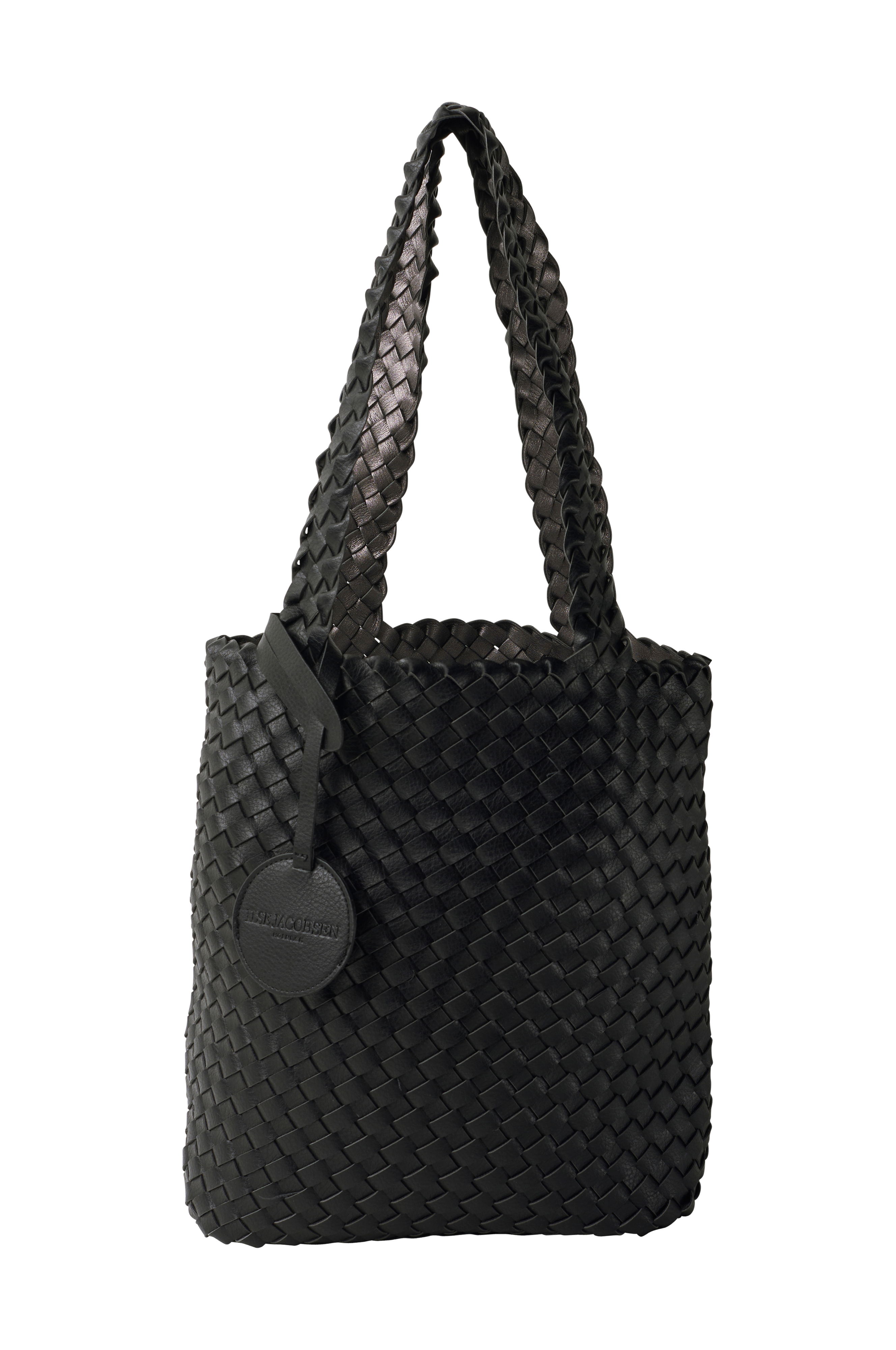 Laukku punottua pehmeää tekonahkaa. Kaksi kantokahvaa. Laukku on käännettävä, sisäpuolella metallinhohtoinen väri. Toisessa kantokahvassa riippuu piilojousihakanen, johon voi kiinnittää esim. lompakon tai avaimet. Mitat: L 33 x K 32 x S 11 cm.