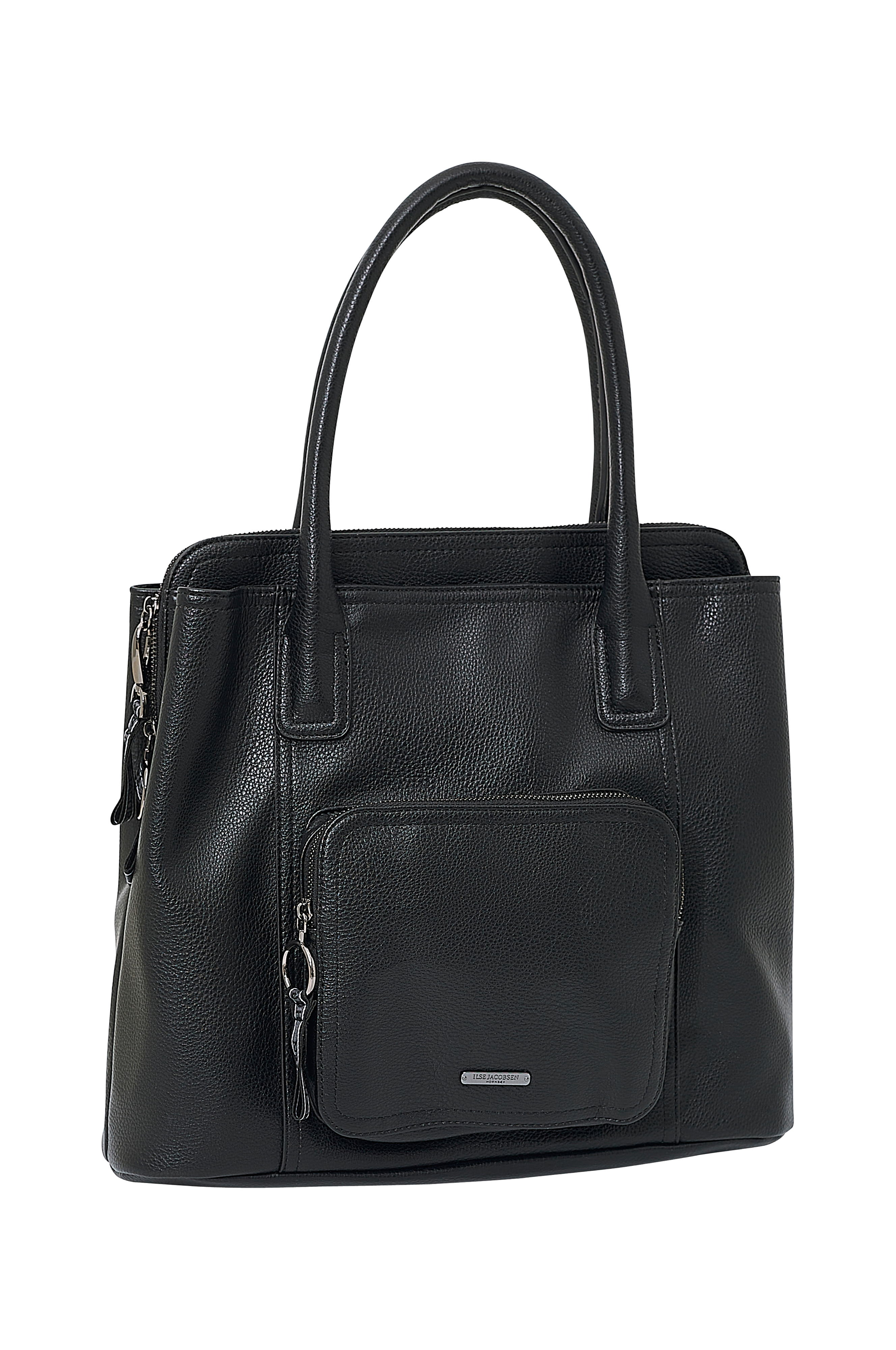 Ilse Jacobsen Bag5PU -laukku, jossa kaksi pyöreää kantokahvaa. Klassinen malli nahkajäljitelmää. Ulkopuolella vetoketjutasku. Kaksi magneetilla suljettavaa lokeroa ja yksi lokero, jossa kaksi vetoketjua ja nailonnauha. Toisessa vetoketjussa on irrotettava soljellinen koukku, ja voit käyttää nailonnauhaa esimerkiksi avaimenperänä. Vetoketjulokerossa on kaksi avotaskua ja yksi vetoketjutasku. Mitat: Leveys 39 cm, korkeus 36 cm, syvyys 12,5 cm. Kantokahvojen korkeus 18 cm.