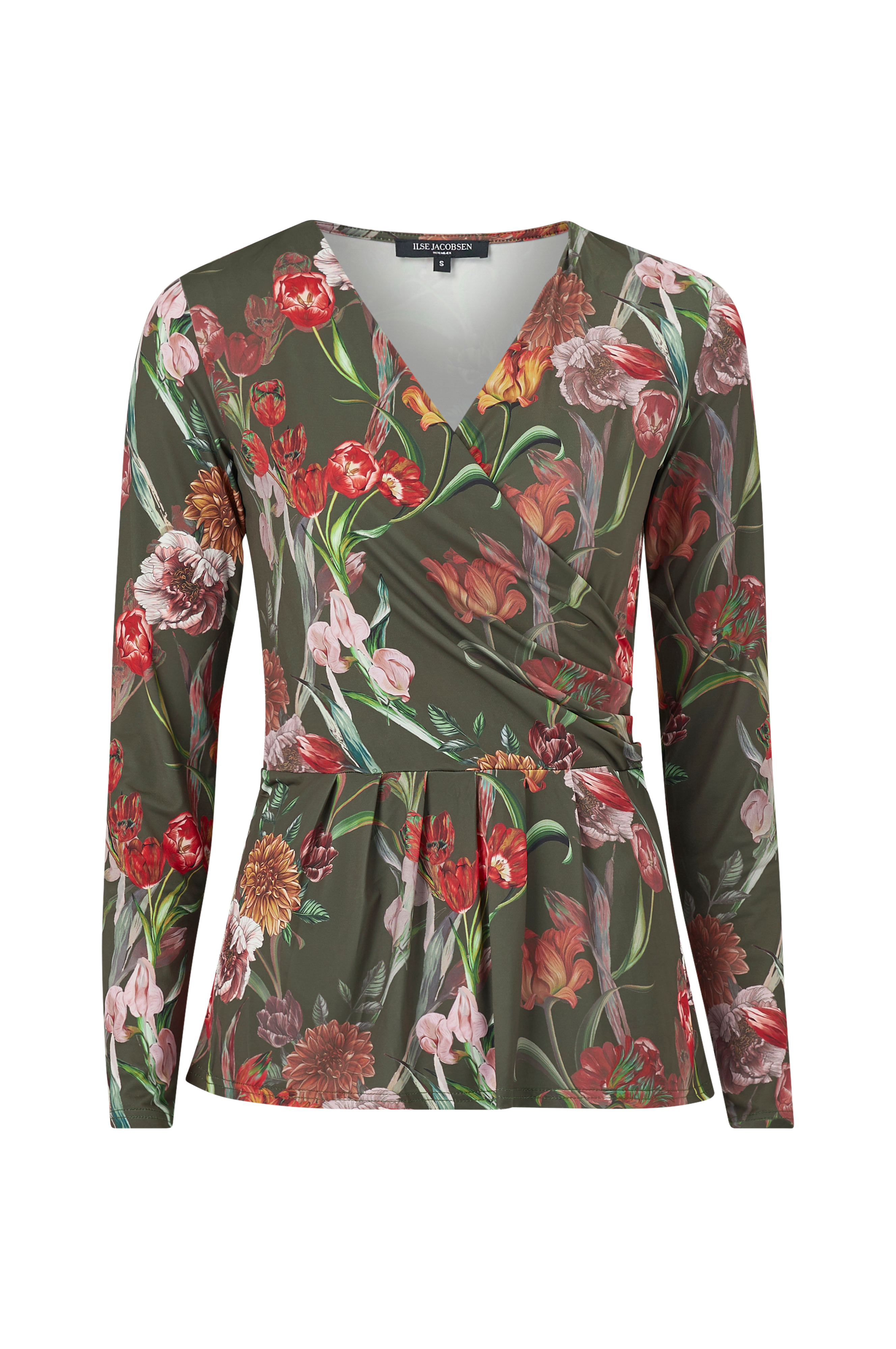 Ilse Jacobsen Nice83Floa Blouse -pusero. Vartalonmyötäinen malli ja kietaisumallinen etuosa, jossa ommellut laskokset sivulla. Poikkileikkaus vyötäröllä, jossa ommellut laskokset ja pitkät, kapeat hihat. Kauniisti laskeutuvaa painokuvioista stretchtrikoota.