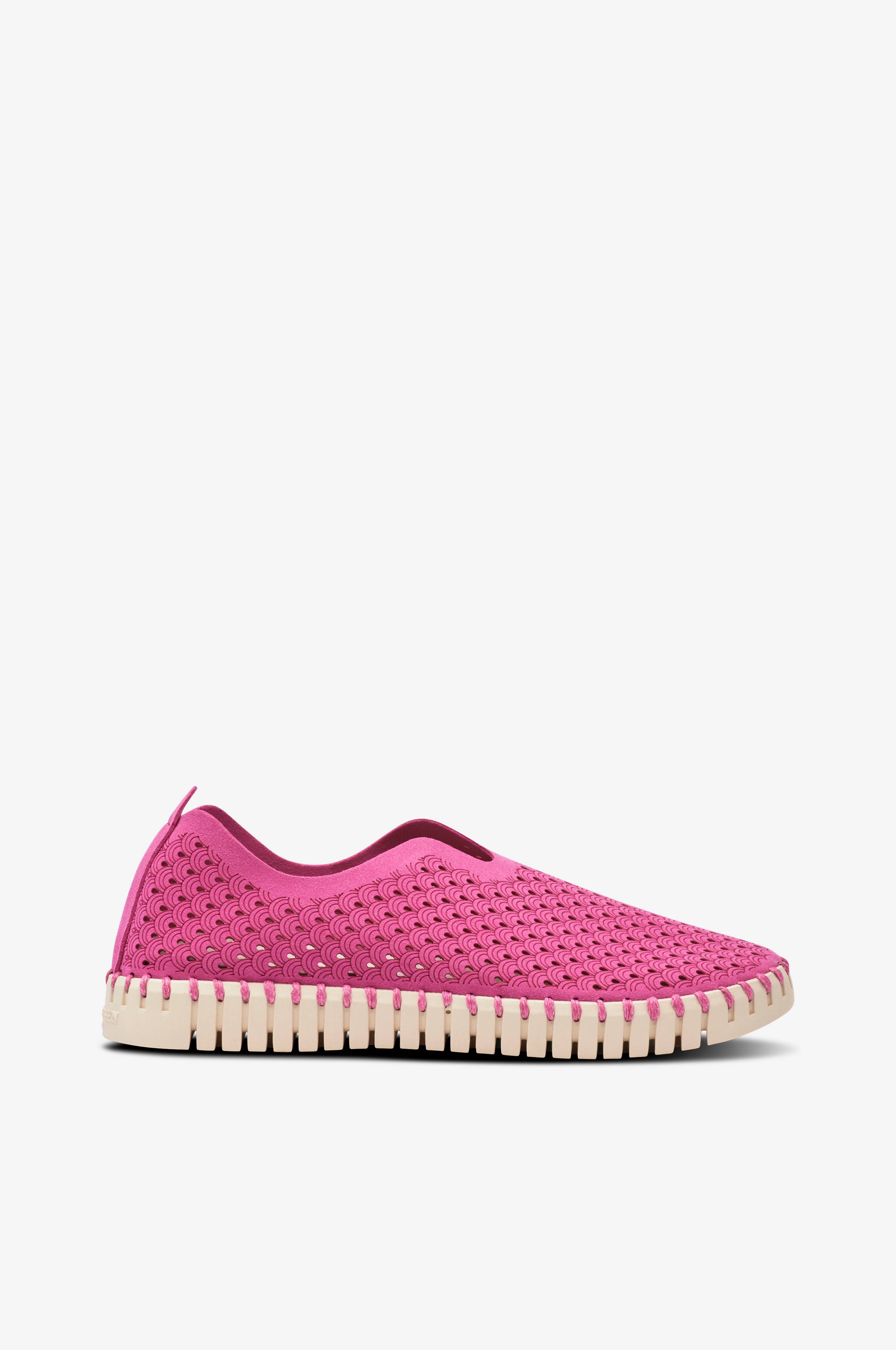 Ilse Jacobsen Tulip 3275 -kengät. Kätevä slip on -malli ja rei'itetty kuvio. Paksu pohja, jossa näkyvät urat ja koristesauma reunassa. Logo takana pohjan reunassa. Pehmeä nahkasisäpohja.