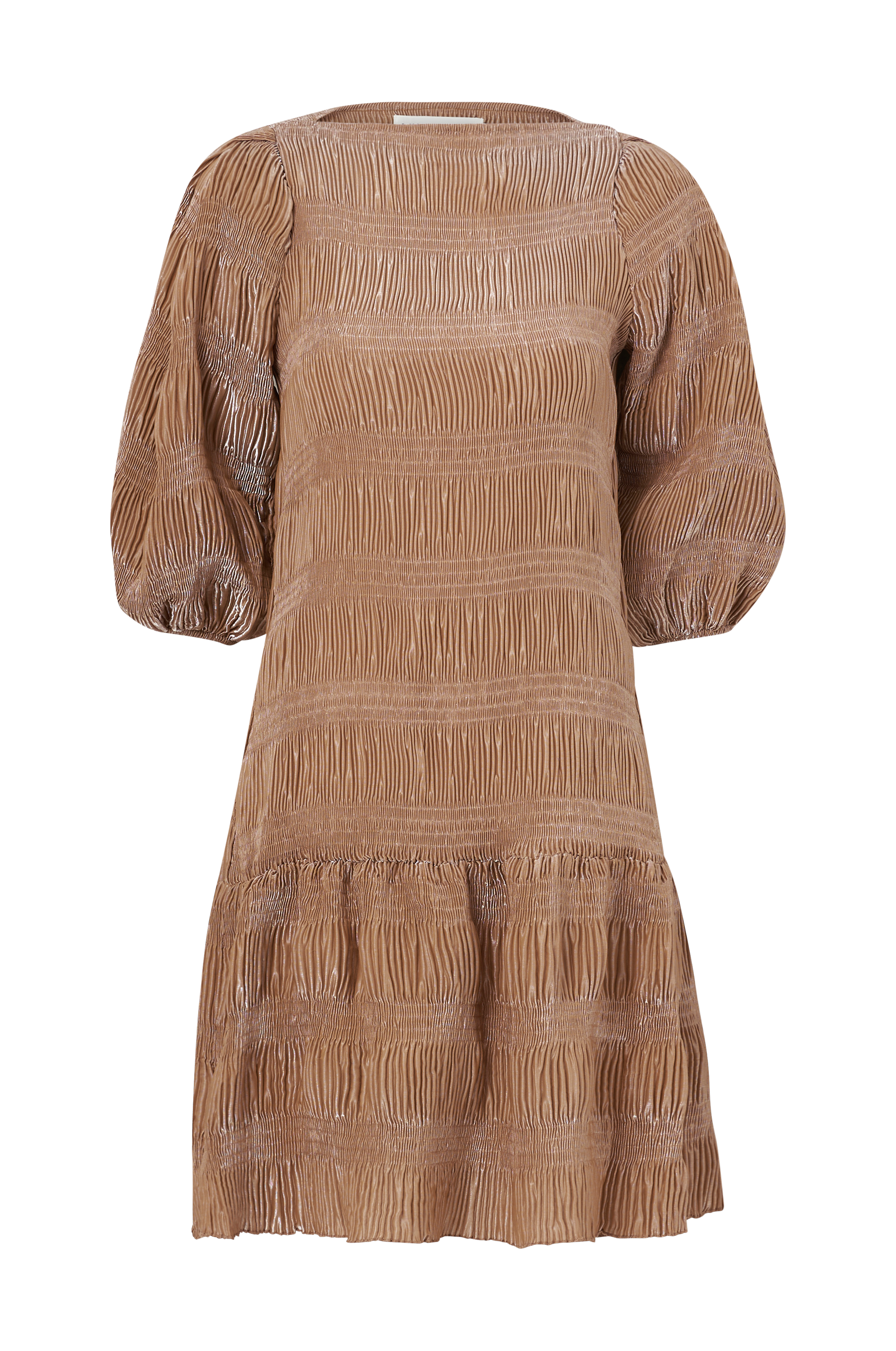 InWear MaisieIW Dress -mekko. Kapeat pliseeraukset ja kauttaaltaan osioita, joissa kuminauhasaumat. Venepääntie ja erittäin väljät puhvihihat, joissa poimutus olalla ja upotettu kuminauha hihansuissa. Leveä, päälleommeltu röyhelö helmassa. Pituus n. 95 cm koossa 36.