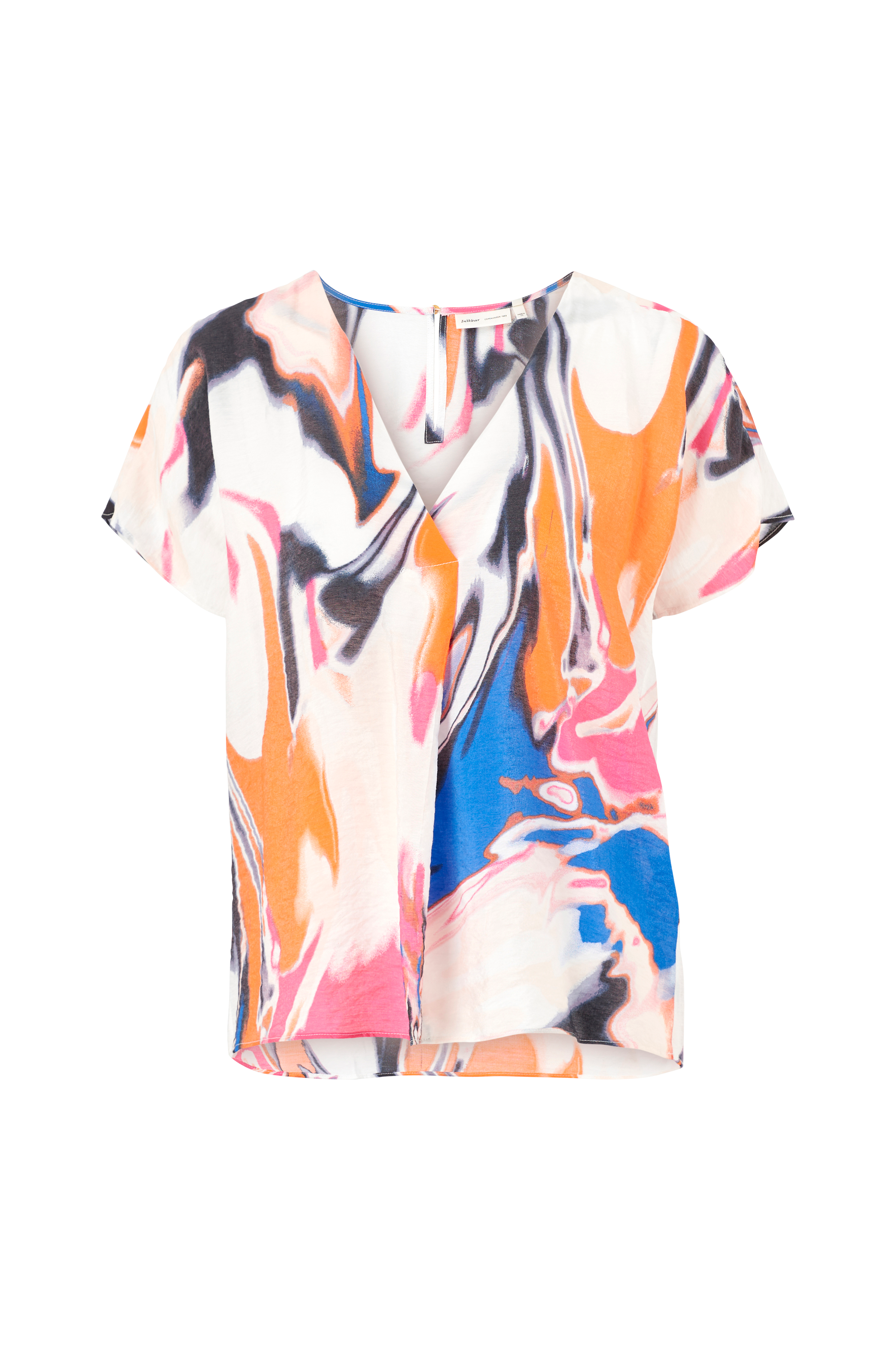 Suora malli ja V-pääntie, jonka alla iso ommeltu laskos. Madalletut olkapäät ja lyhyet kimonohihat. Halkio ja nappi niskassa.