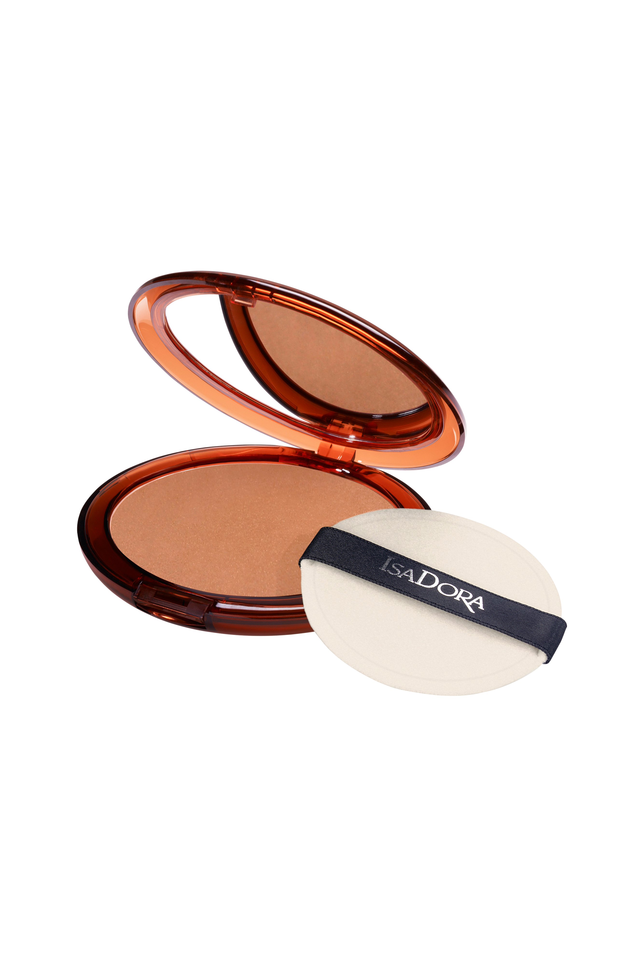Aurinkopuuteri, jossa runsaasti pigmenttiä. Suurella puuterilla luot raikkaan päivettyneen lookin.