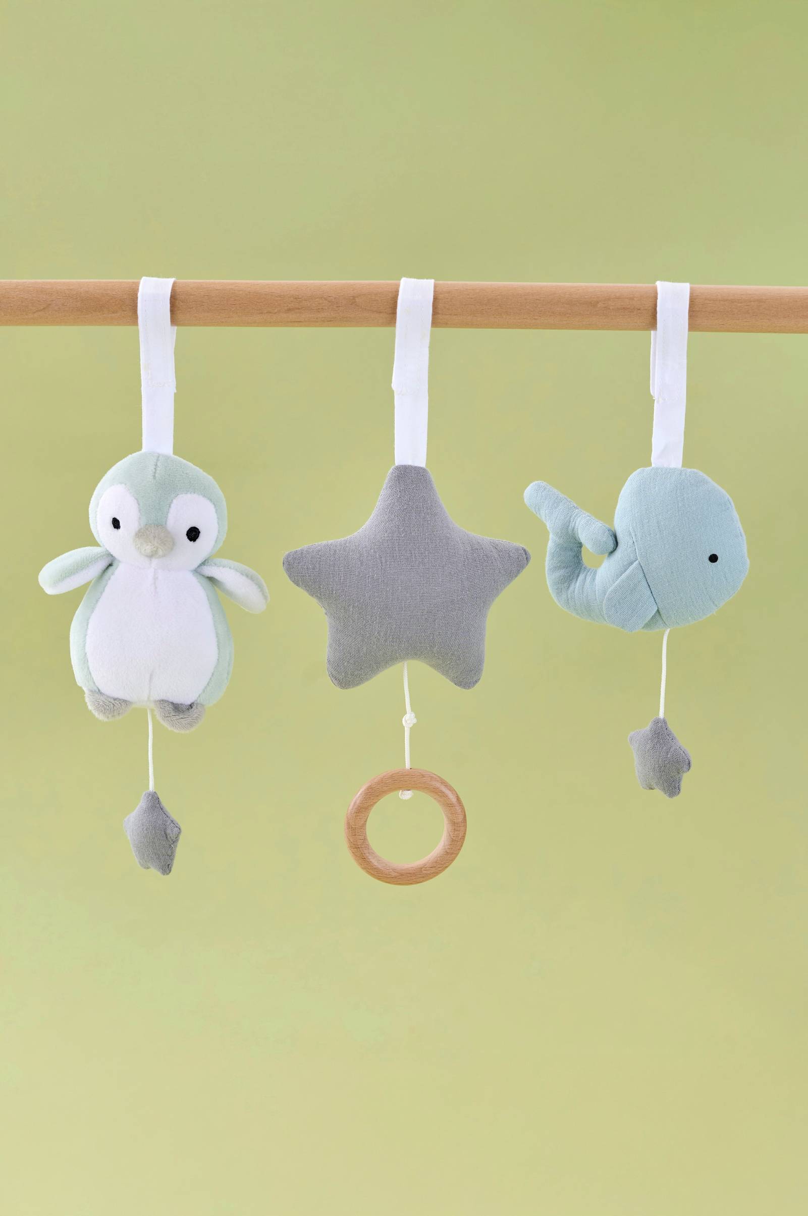Suloiset pehmeät vauvojen jumppalelut, kuten tähti, pingviini ja valas. Tähti soittaa tuutulaulua. Kutsuvat muodot ja värit viihdyttävät vauvaa ja stimuloivat visuaalisten ja motoristen taitojen kehitystä. Leluissa on pitkät lenkit, jotka on helppo kiinnittää vauvajumppaan tai useimpiin pinnasänkyihin ja kantokopioihin, jotta ne ovat helposti mukana matkalla. Pestävä käsin. Valmistettu hienoimmasta musliinista ja täyte polyesterikuitua. Vauvalle stimuloivia leluja, joissa on mielenkiintoisia muotoja ja värejä
